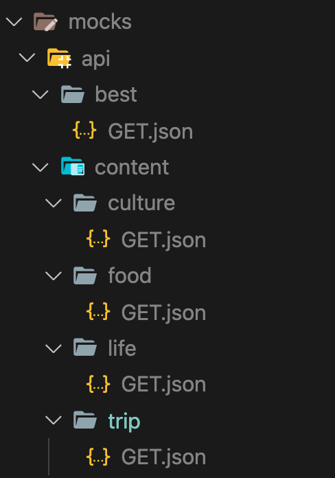 응답할 목업 API 작업이 많을 때는 connect-api-mocker를 사용하자. 해당 패키지로 실제 REST API 서버 없이 쉽게 REST API 테스트를 할 수 있다. 특정 폴더를 만들어서 파일 경로대로 API 응답을 해주는 기능을 한다.