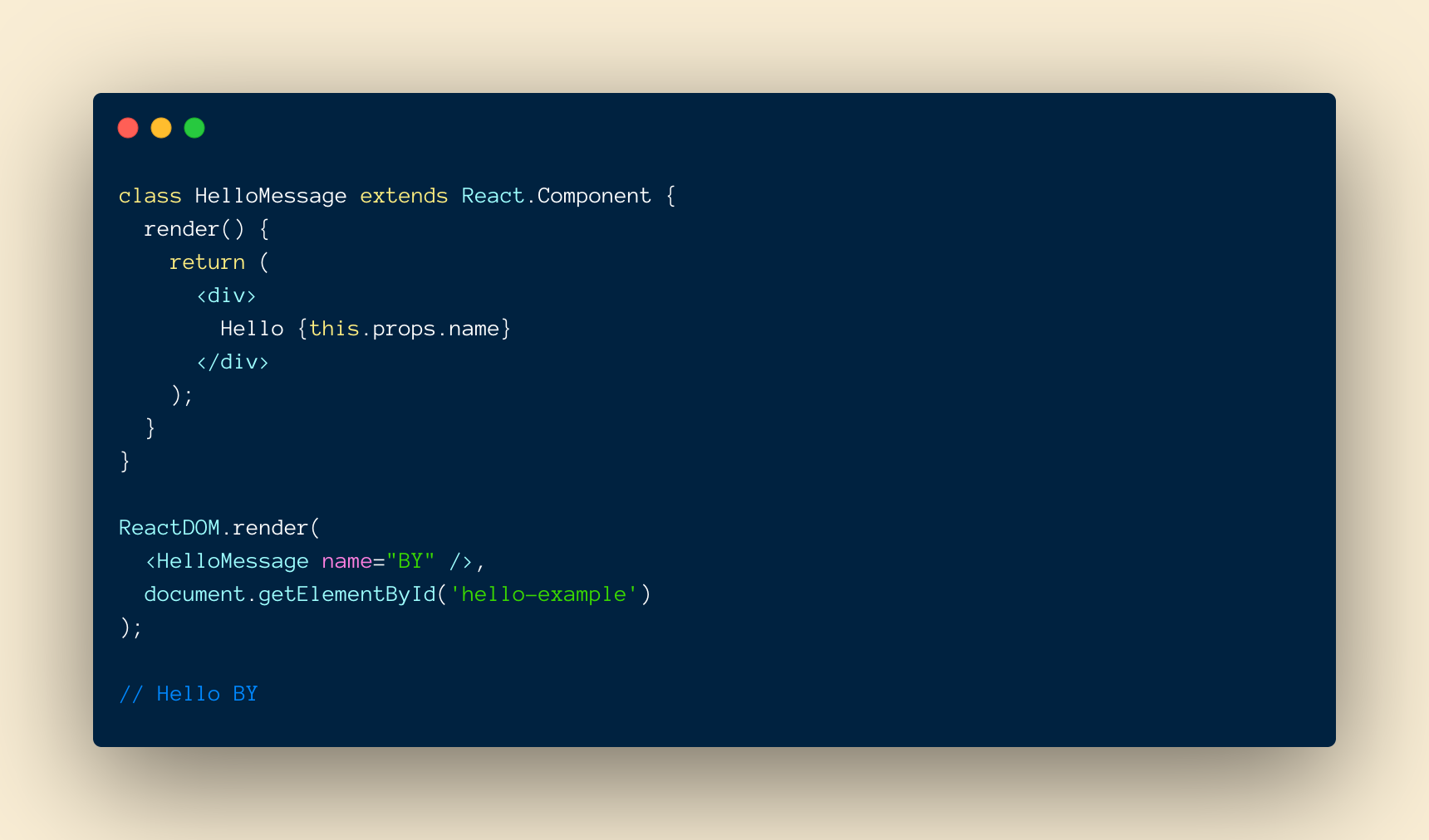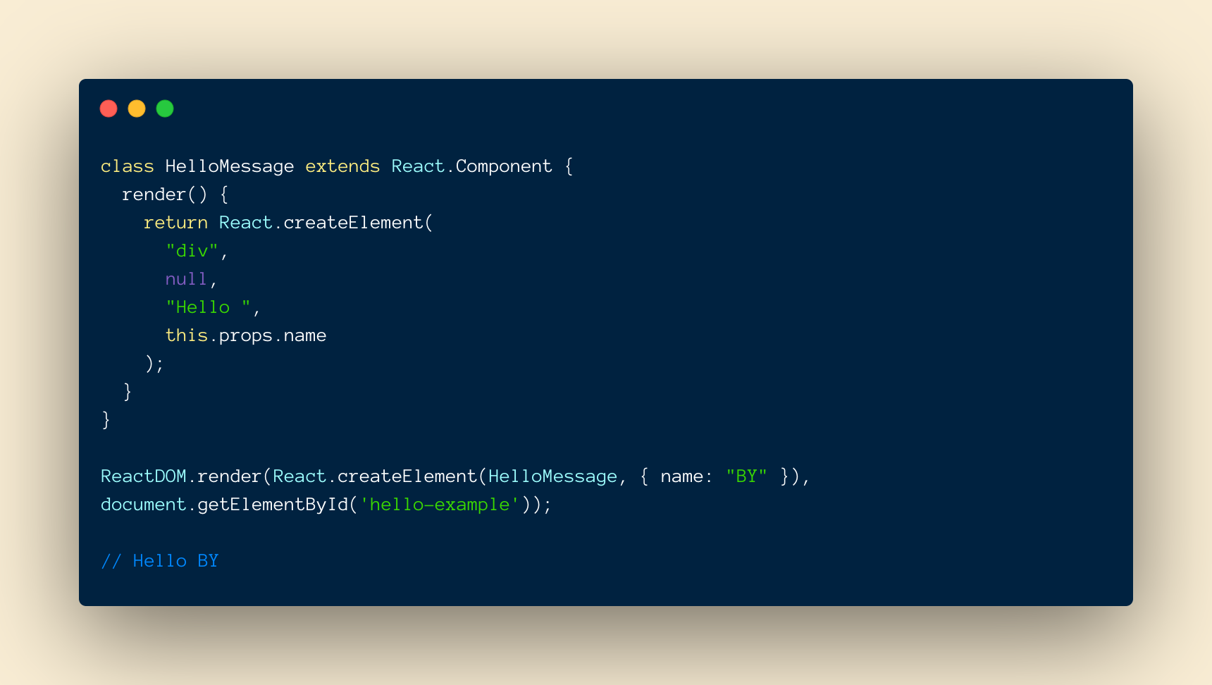 "Hello BY"라는 div를 생성하는 컴포넌트 입니다. HTML도 아니고 특이한 문법이네요. 리액트는 리액트를 사용하기 위해 JSX를 꼭 사용해야 되는 것은 아닙니다.