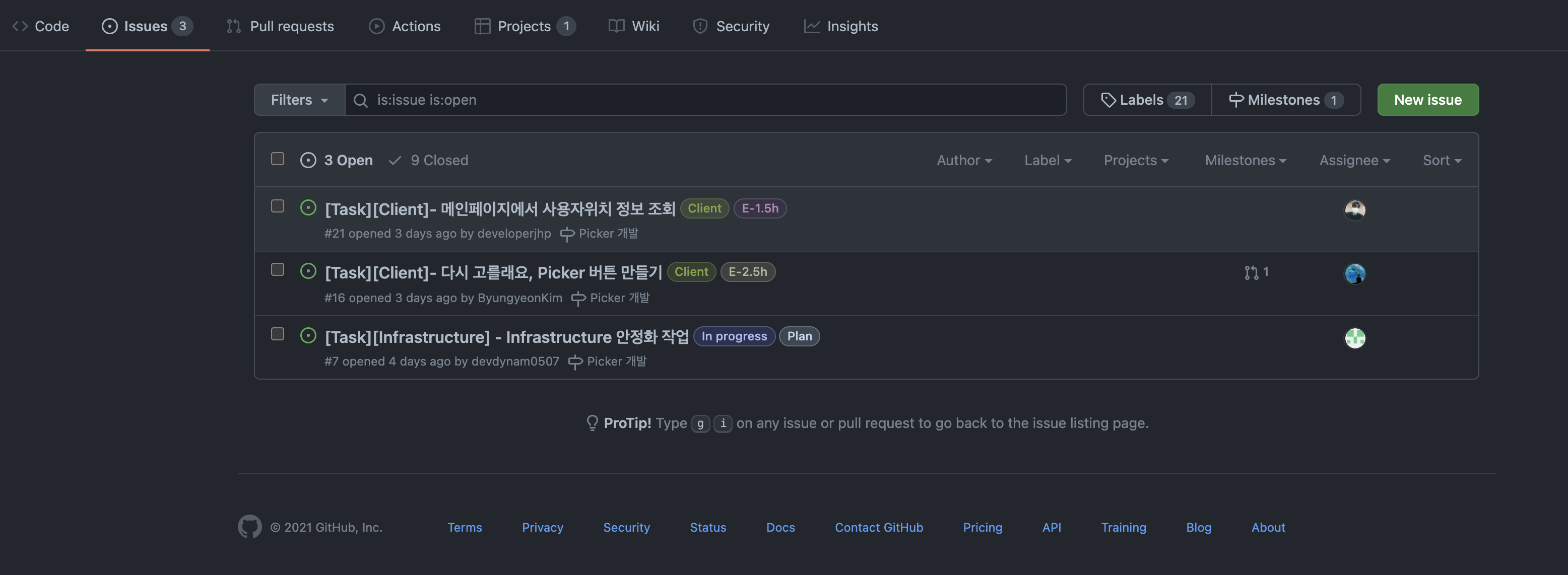 그리고 깃허브를 적극 활용하는 팀원을 만나서 다양한 경험을 했다. 이슈 등록, 프로젝트 칸반 보드 등을 통해 태스크를 나누고, 효율적으로 일을 나눠 진행할 수 있었다.