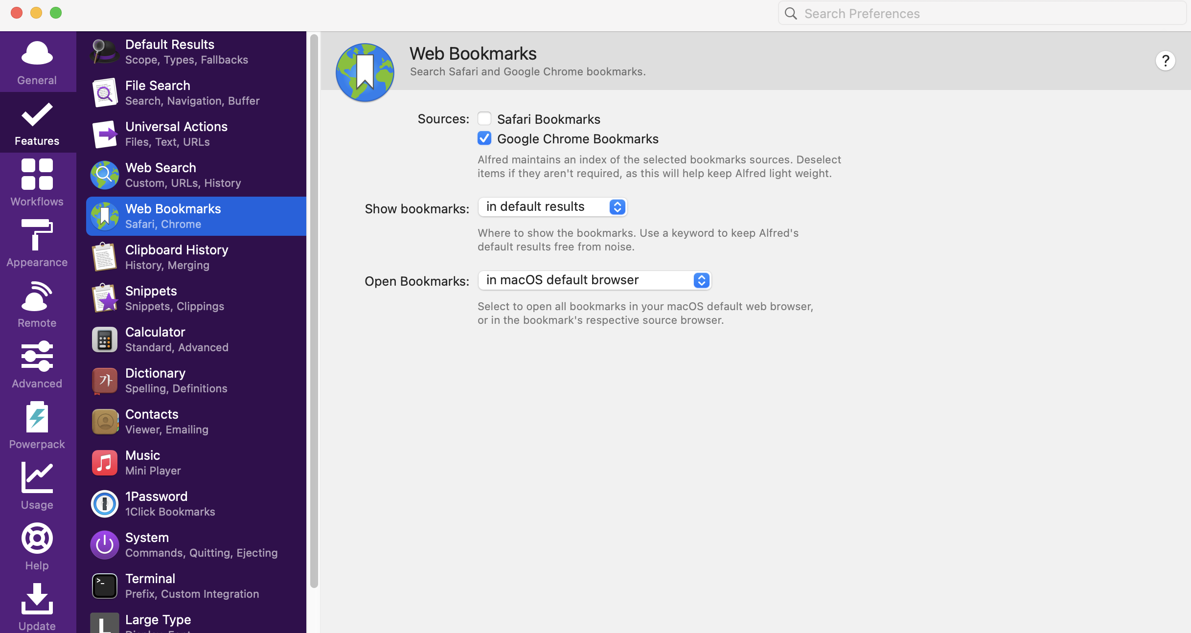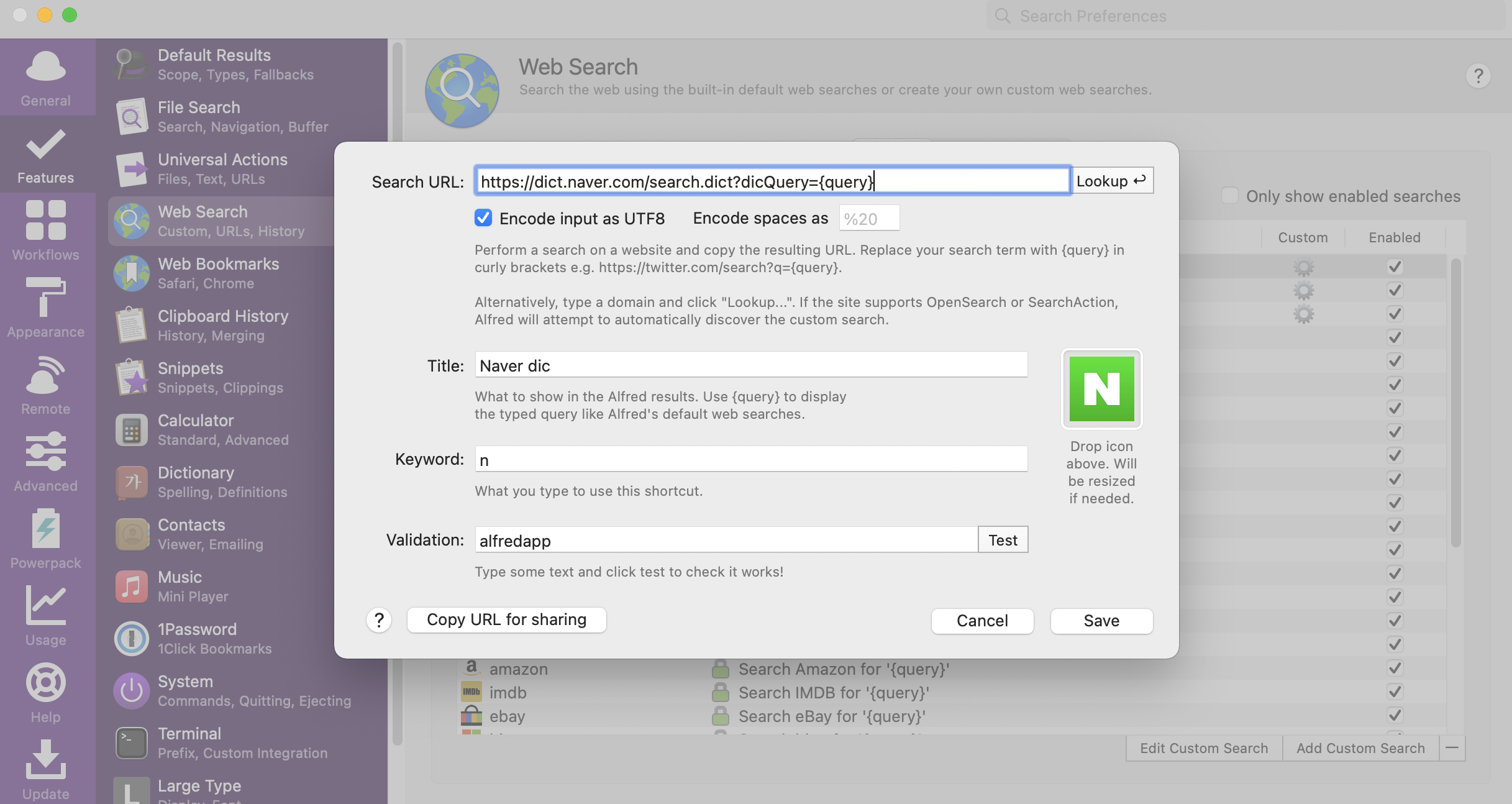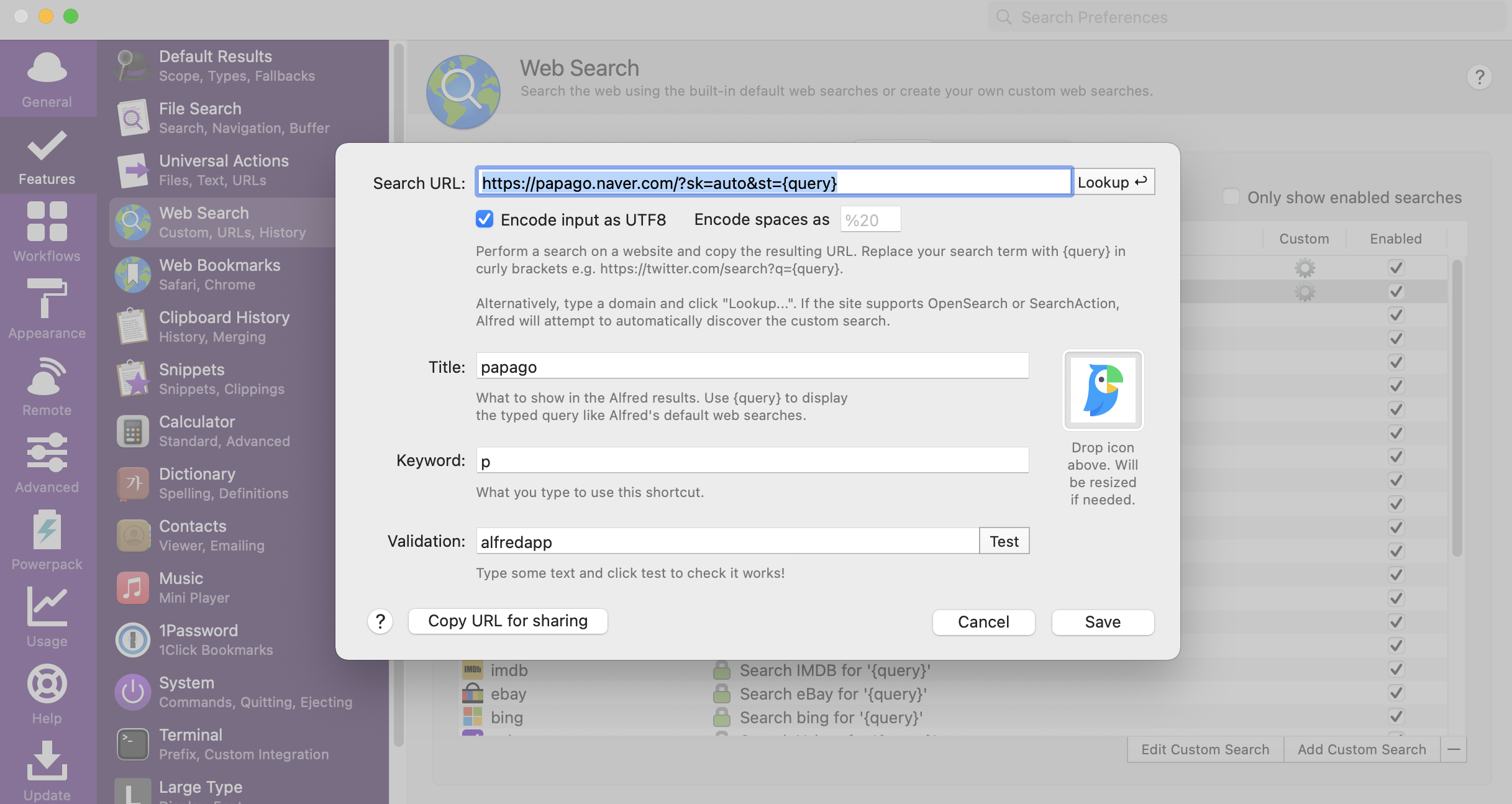 제일 자주 사용하는 기능이다. 단축키로 알프레드를 실행해서 검색할 단어들을 입력하면 바로 검색이 가능하다. 개발 중에 구글링, 네이버 사전, 파파고 번역 등을 자주 사용한다. 기본적으로 검색 시, 구글로 검색이 되기 때문에 대부분 해결이 가능하지만 네이버 사전으로 검색하는 게 더 편할 때가 있고 번역도 마찬가지이다. 그래서 커스텀을 해보자.