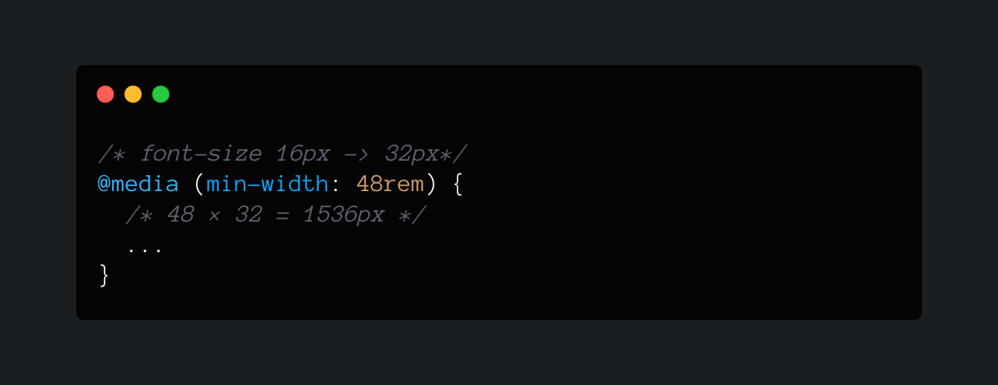📌 만약에 레이아웃 전환점이 고정된 픽셀의 너비를 가지고 있다면, 오직 화면 크기만이 그 효력을 갖습니다. 하지만 rem 기반의 전환점이라면 여러 폰트 크기에도 올바로 반응하겠지요.