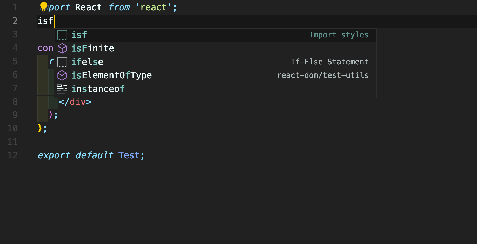 키워드 isf만 입력하면 "import styles from './.module.css'"가 자동입력 된다. 정말정말 편리하다. 이렇듯 사용성은 무궁무진하다. 정말 다양하게 자주 사용하는 코드를 스니펫으로 만들어서 사용할 수 있는 것이다.