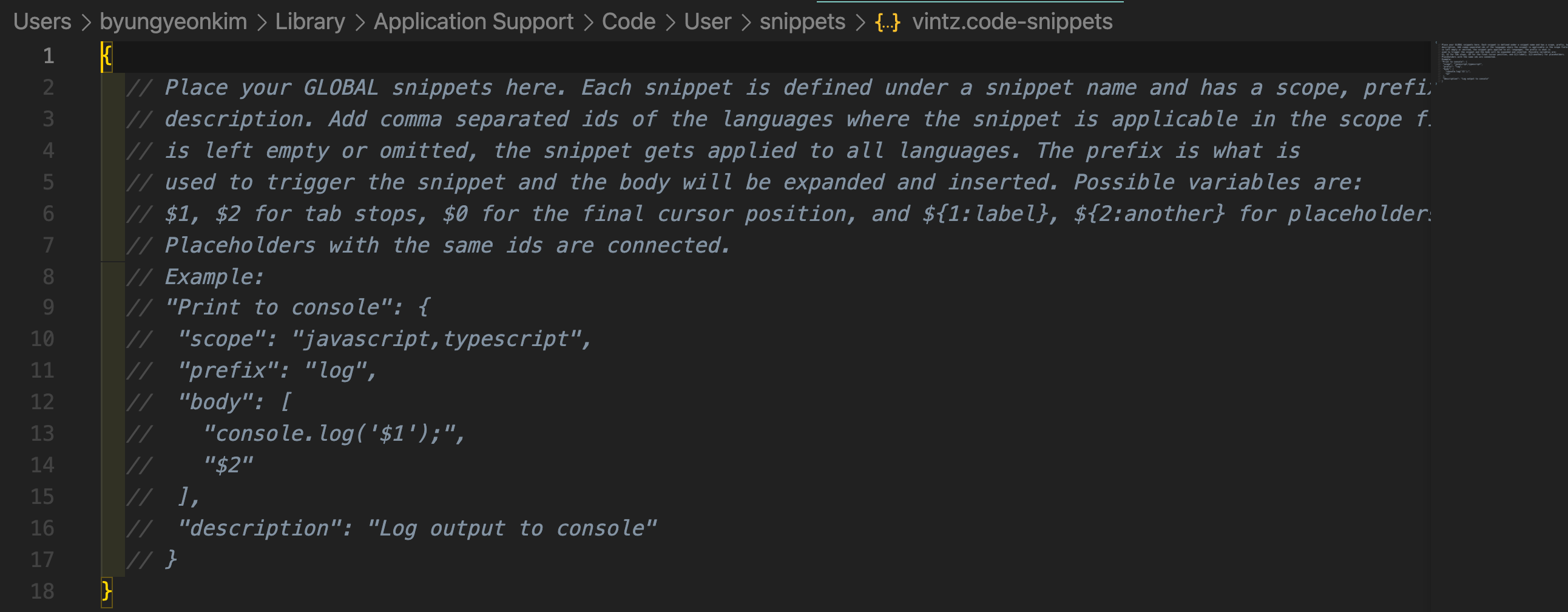 사용자 코드 조각 구성(Configure User Snippets) 사용하기