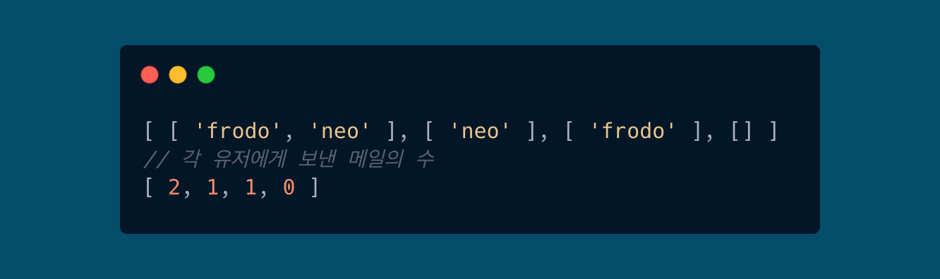유저가 신고한 ID가 정지 되었을 경우 메일을 받게 된다. 따라서 정지 기준인 k회 이상 신고된 ID를 변수에 담는다. 유저마다 신고한 ID가 정지가 됐다면 해당 ID를 추가한다. 마지막으로 그 결과의 수를 반환한다.