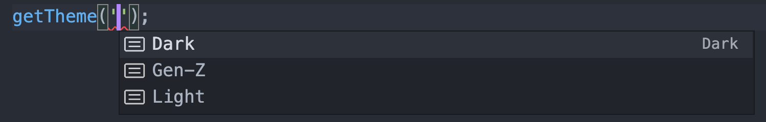 위 예시와 같이 Theme을 미리 정의 해두면 자동완성이 되어 함수를 더 편하게 사용할 수 있으며, 인수로 어떤 값을 주어야 할지 알 수 있다.