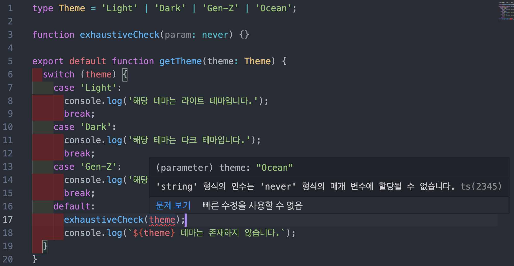 타입스크립트는 "never 타입은 아무 값도 리턴하지 않는데 'Ocean'이 전달 된 것 같아. 문자열은 never 타입의 매개 변수에 할당될 수 없어"라고 말한다. 이렇게 코드 수준에서 개발자의 실수를 줄여줄 수 있다.