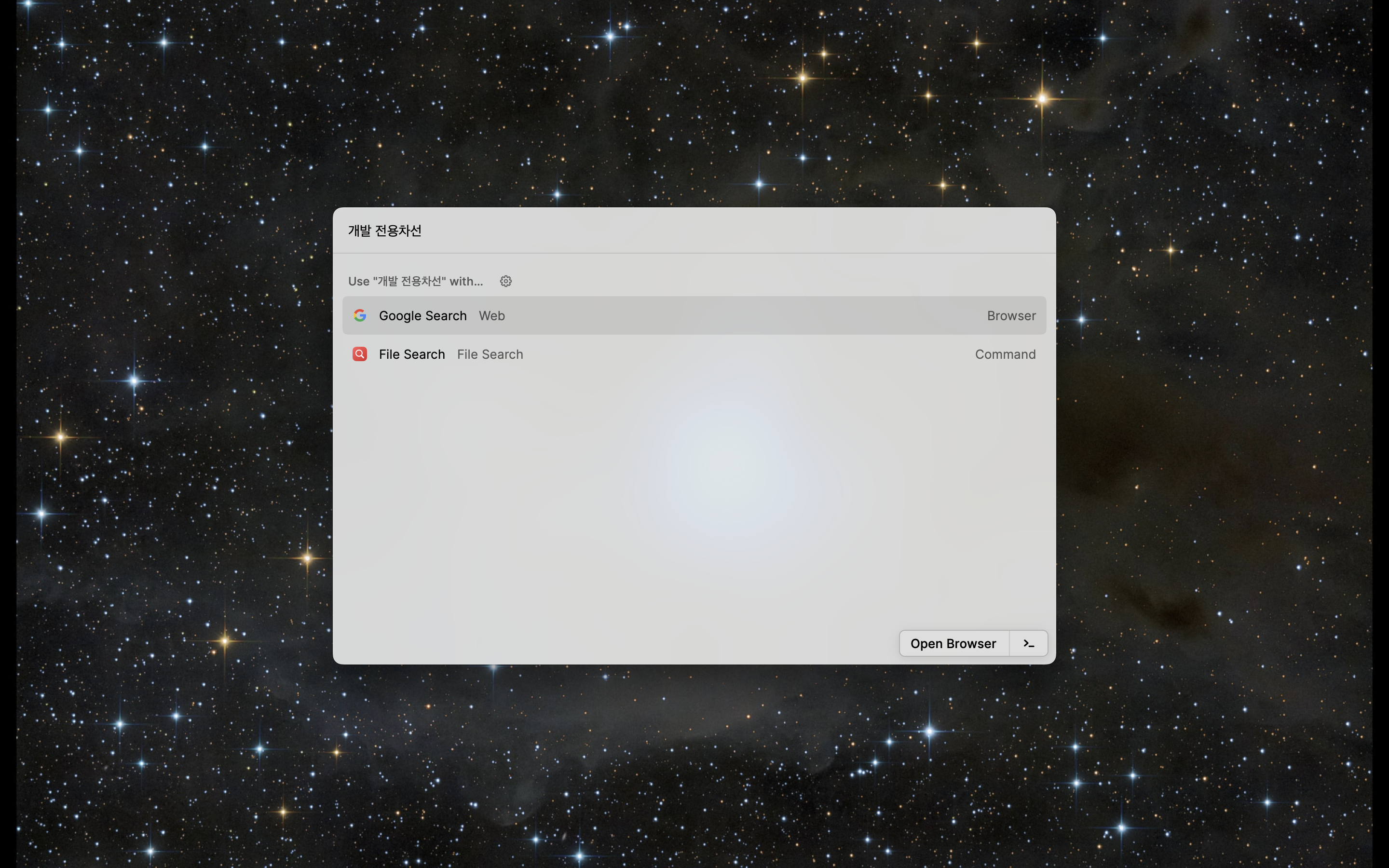 가장 기본적인 검색 기능을 살펴보자. option + space bar를 누르면 레이캐스트가 실행되고, 입력란에 텍스트를 입력한 후 엔터를 치면 검색이 가능하다.