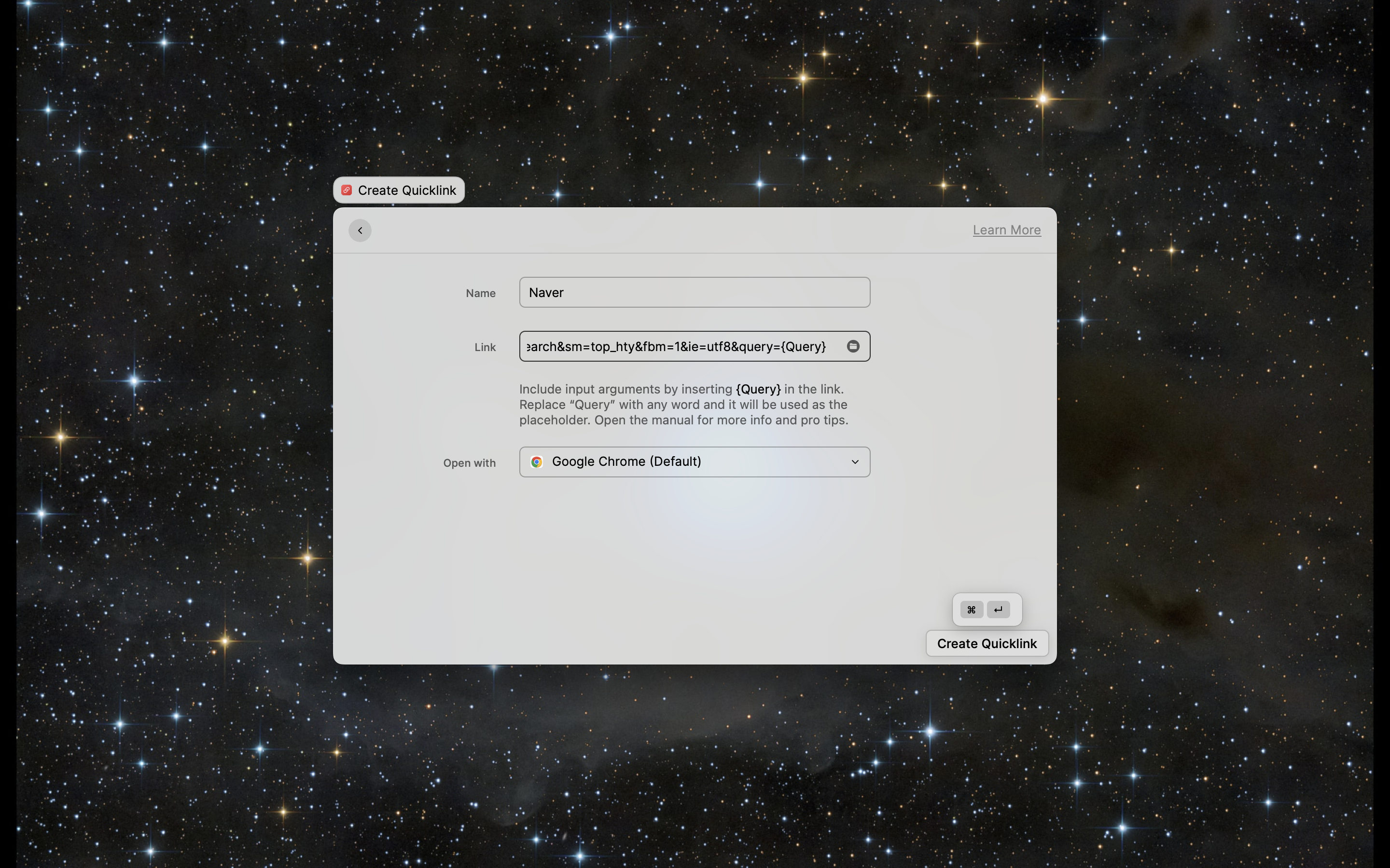 네이버 검색을 위해 단축키로 레이캐스트를 실행한 후 Create Quicklink를 선택해보자. 그럼 아래 이미지와 같이 이름, 링크, 해당 링크를 검색할 브라우저 선택이 있다. 그렇게 생성한 후 Manage Fallback Commands를 통해 Naver를 Enabled 시켜주면 된다.