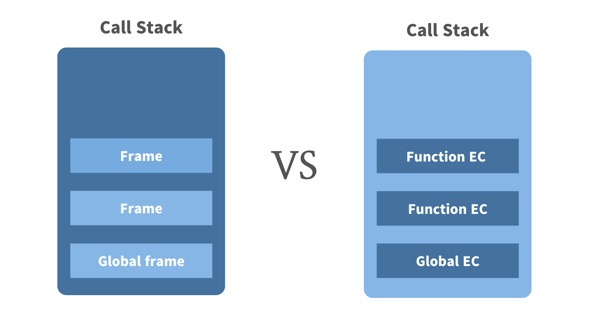 생각해보자. V8 엔진은 C++로 작성되었으며 결국 함수를 호출하고 실행하는 것은 같다. 그럼 결국 콜 스택에 쌓이는 것은 스택 프레임을 뜻하고, 실행 컨텍스트는 V8 입장에서 변수/객체이다. (V8에서 스택 메모리 영역은 원시값과 실행 콘텍스트, 메서드, 객체 포인터를 포함한 정적 데이터를 저장한다. 여기서 말하는 객체는 식별자에 의해 참조되는 공간을 뜻한다.) 자바스크립트 입장에서 생각해보면 자바스크립트도 콜 스택이 존재하고 여기에 쌓이는 스택 프레임 같은 개념이 실행 컨텍스트인 것이다.