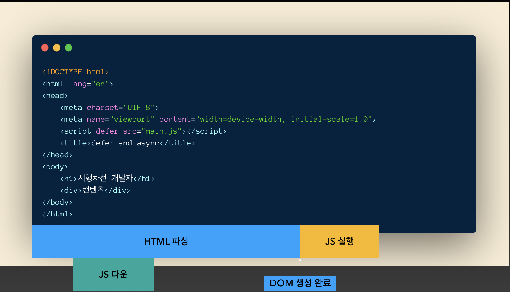 - 브라우저는 HTML을 쭉 읽다가 <script> 태그를 만나면 스크립트를 먼저 실행해야 되므로 HTML 파싱(DOM 생성)을 멈춥니다.
