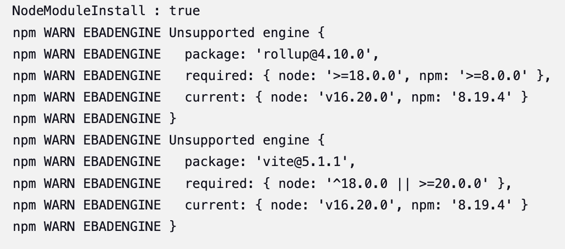 플랜 B를 위해 브랜치를 새로 만들고, 해당 브랜치에서 코드를 작성 했다. 먼저, Vite는 버전 18+ 또는 20+ 이상의 Node.js를 요구한다. 당시 프로젝트의 노드 버전은 지원이 중단된 16.xx.x 버전이었기 때문에, 별 고민 없이 현재 기준의 LTS 버전으로 업데이트했다.