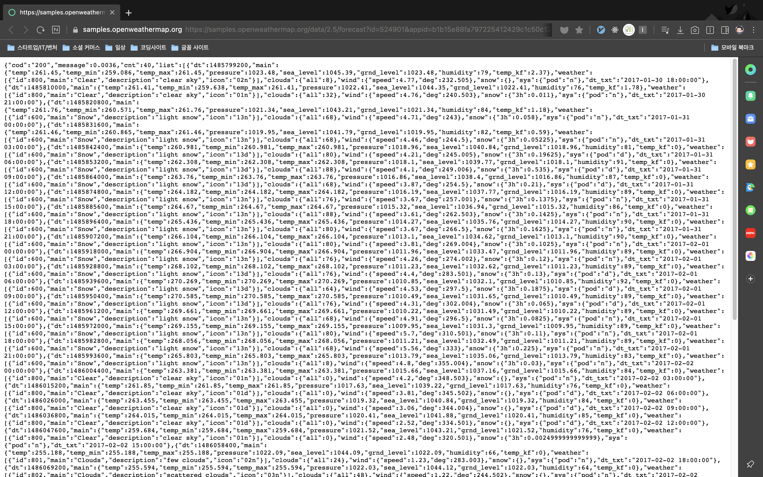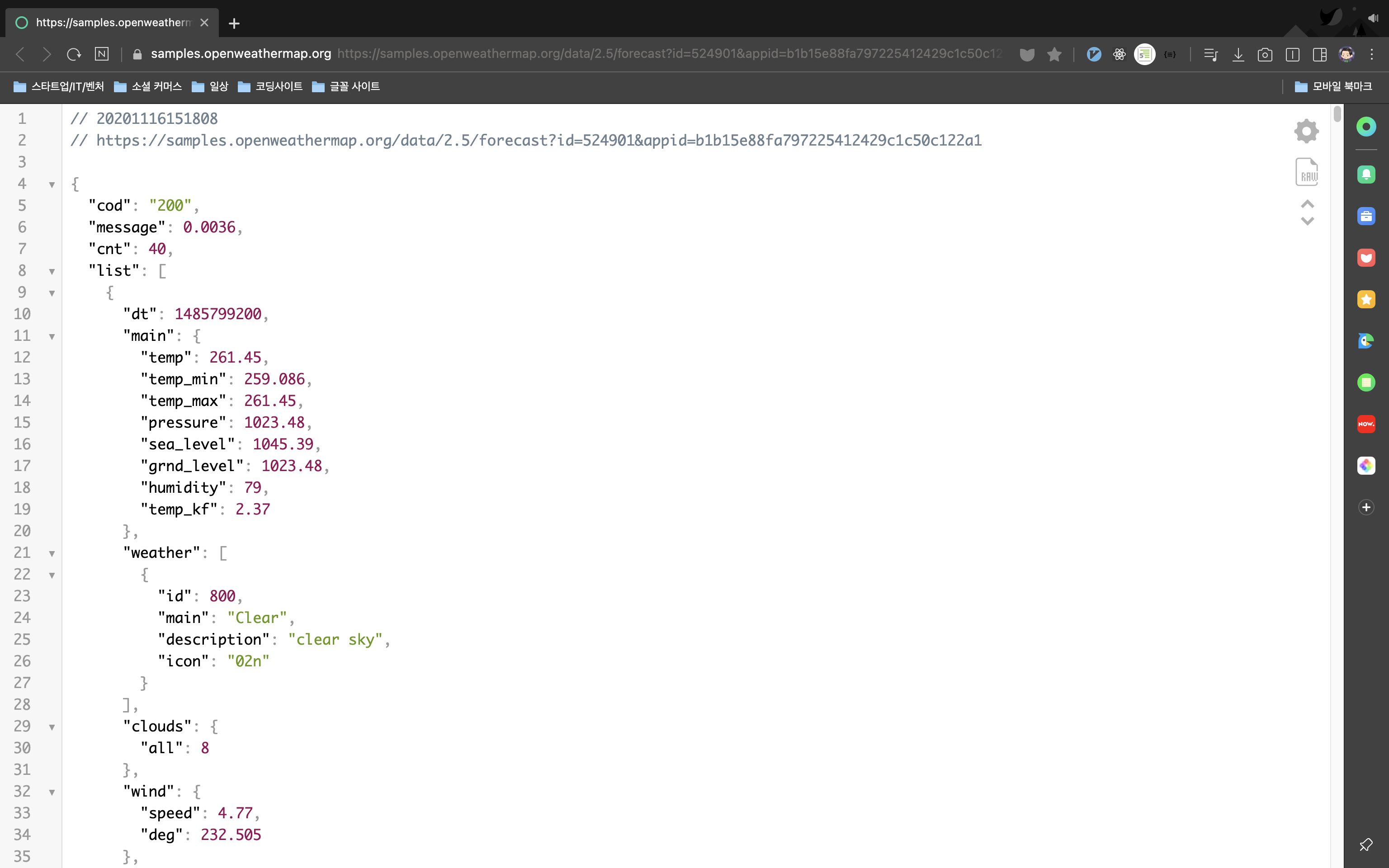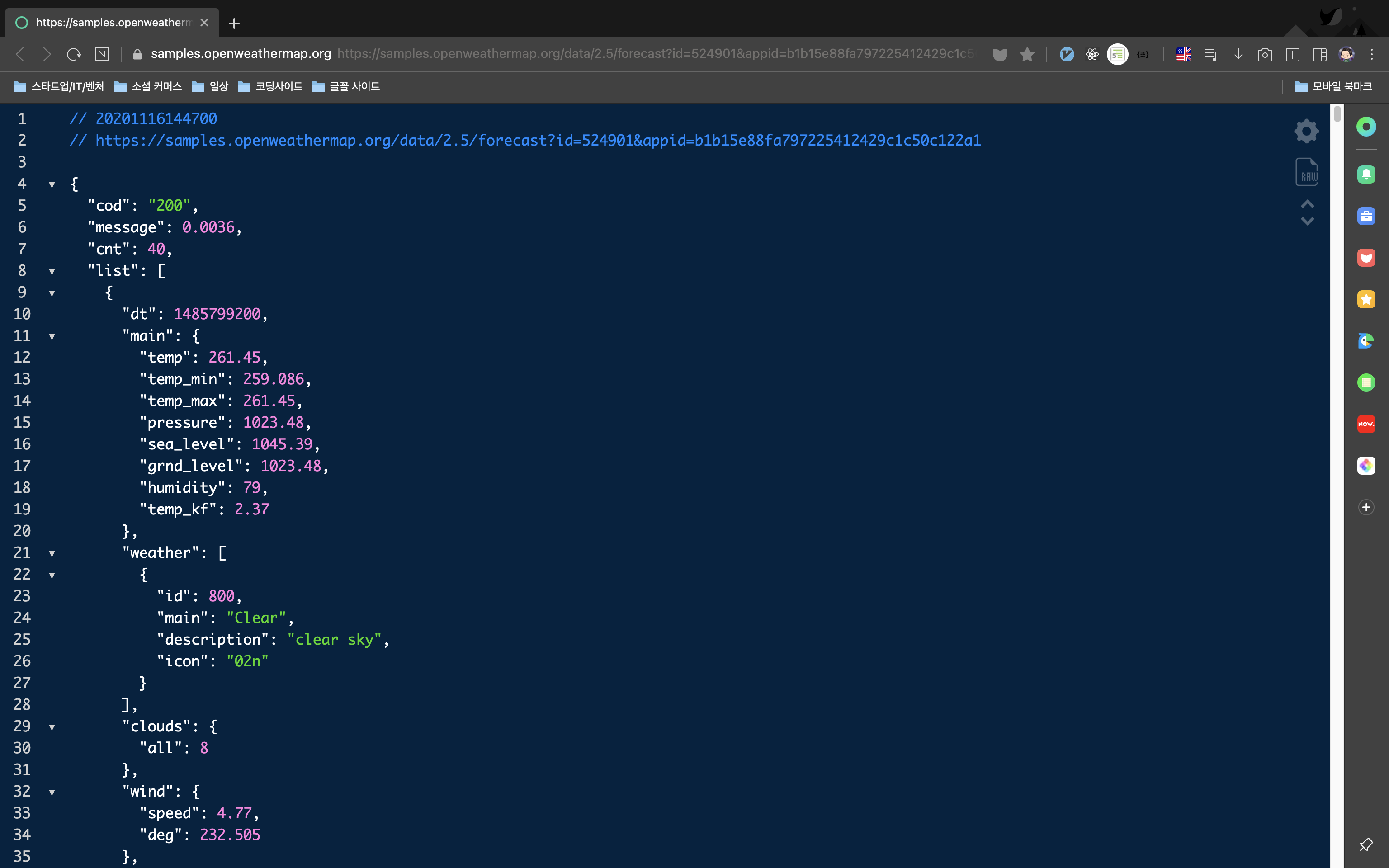 JSON을 불러올 때 가독성이 너무 좋지 않아서 방법을 찾던 중 괜찮은 확장 프로그램을 찾아서 공유해봅니다..! 크롬 웹스토어에 들어 가셔서 JSON이라고 검색하시면 나옵니다. 날씨 API로 예를 들어보겠습니다.