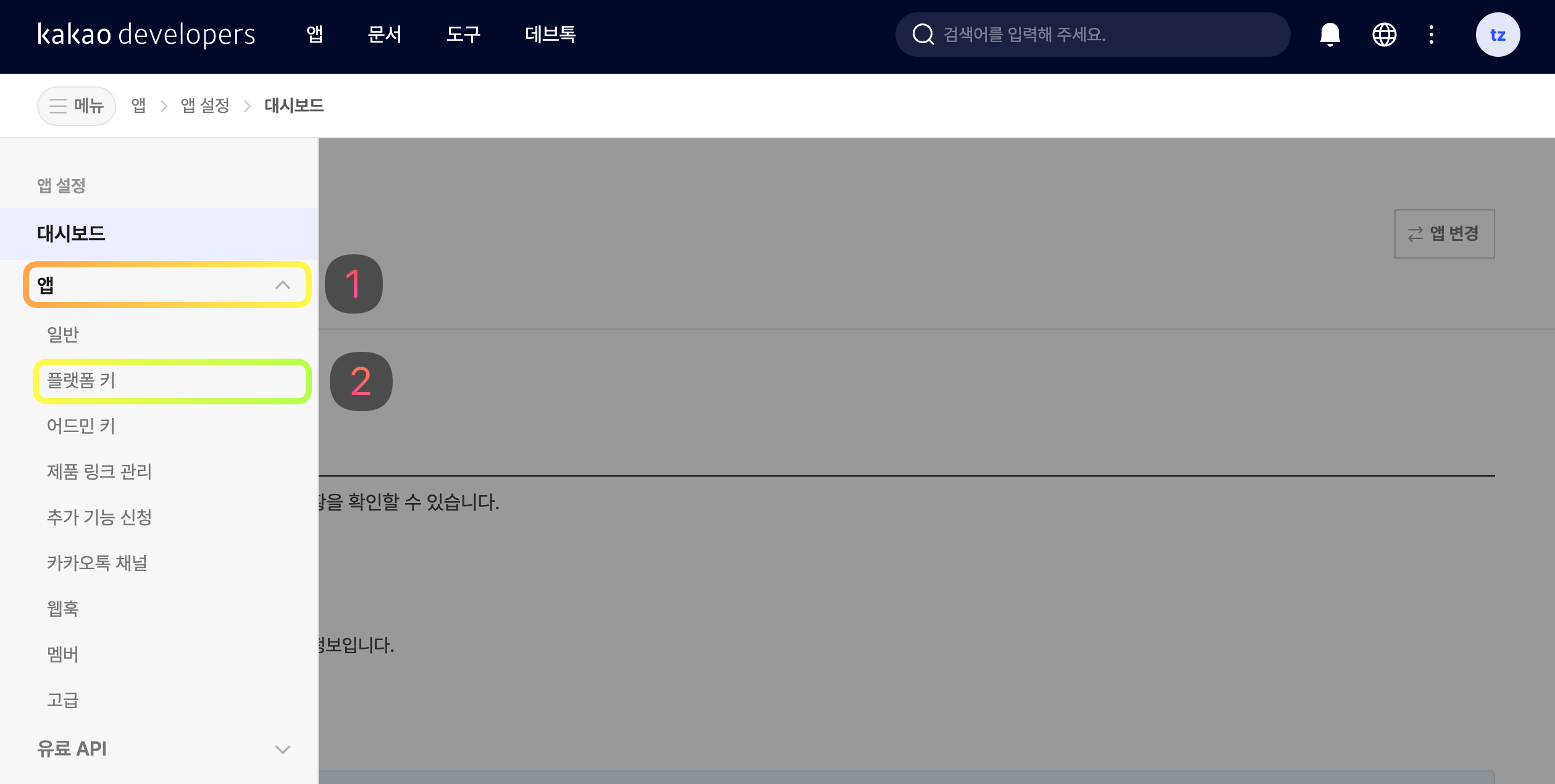 7. 키 복사 및 도메인 설정을 위해, 플랫폼 키 페이지로 이동