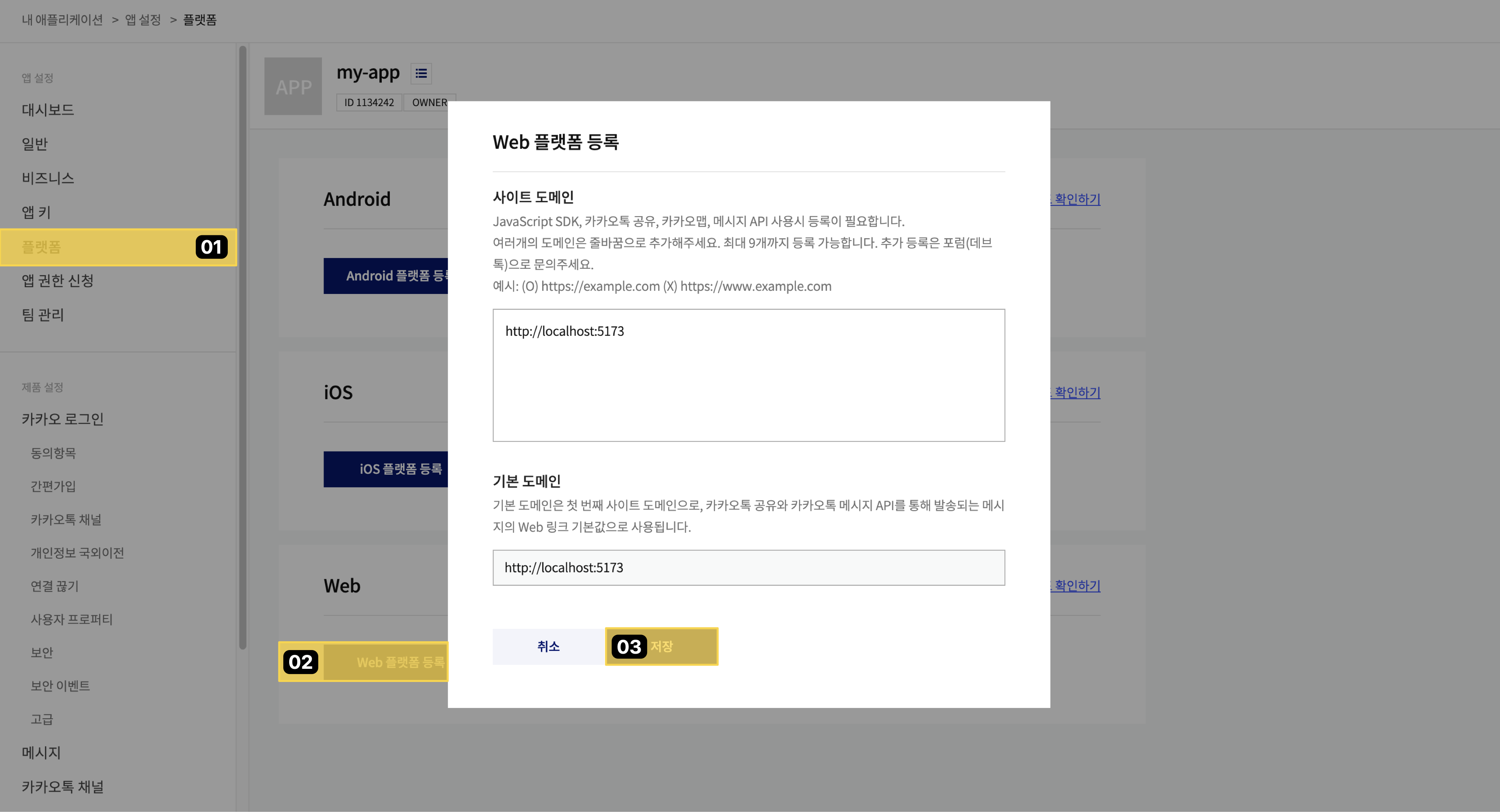 5. 플랫폼 - Web 플랫폼 등록 - 저장(Vite dev 서버의 기본 포트는 5173이다.)