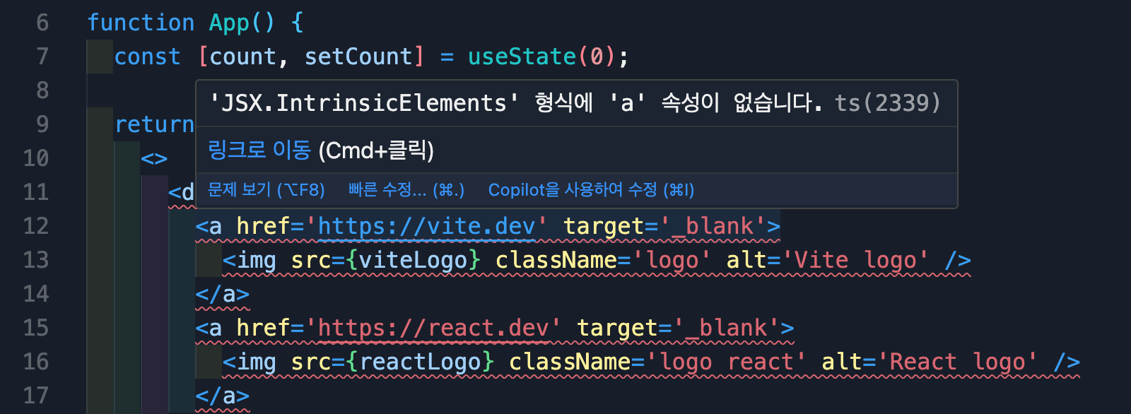 Vite로 React 타입스크립트 프로젝트를 만들었을 때, 컴포넌트 전반에 "jsx.intrinsicelements 형식에..."와 같은 에러 메시지가 뜬다면 타입스크립트 버전 문제일 확률이 높다.