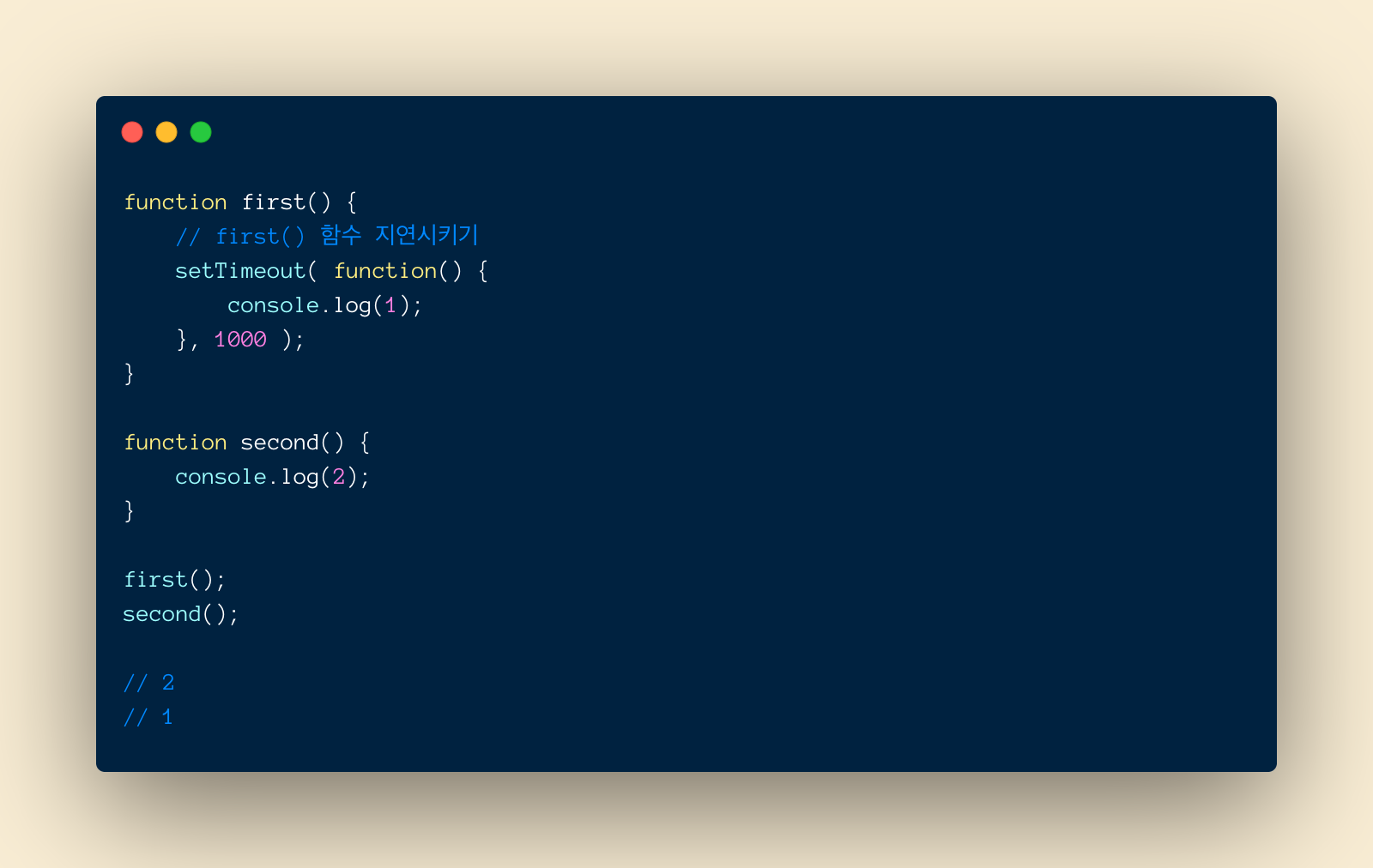 여기서 중요한 것은 first()함수를 먼저 실행했음에도 불구하고 지연시킨 시간을 기다리지 않고 second()함수가 먼저 실행 됐음(비동기)을 의미합니다.