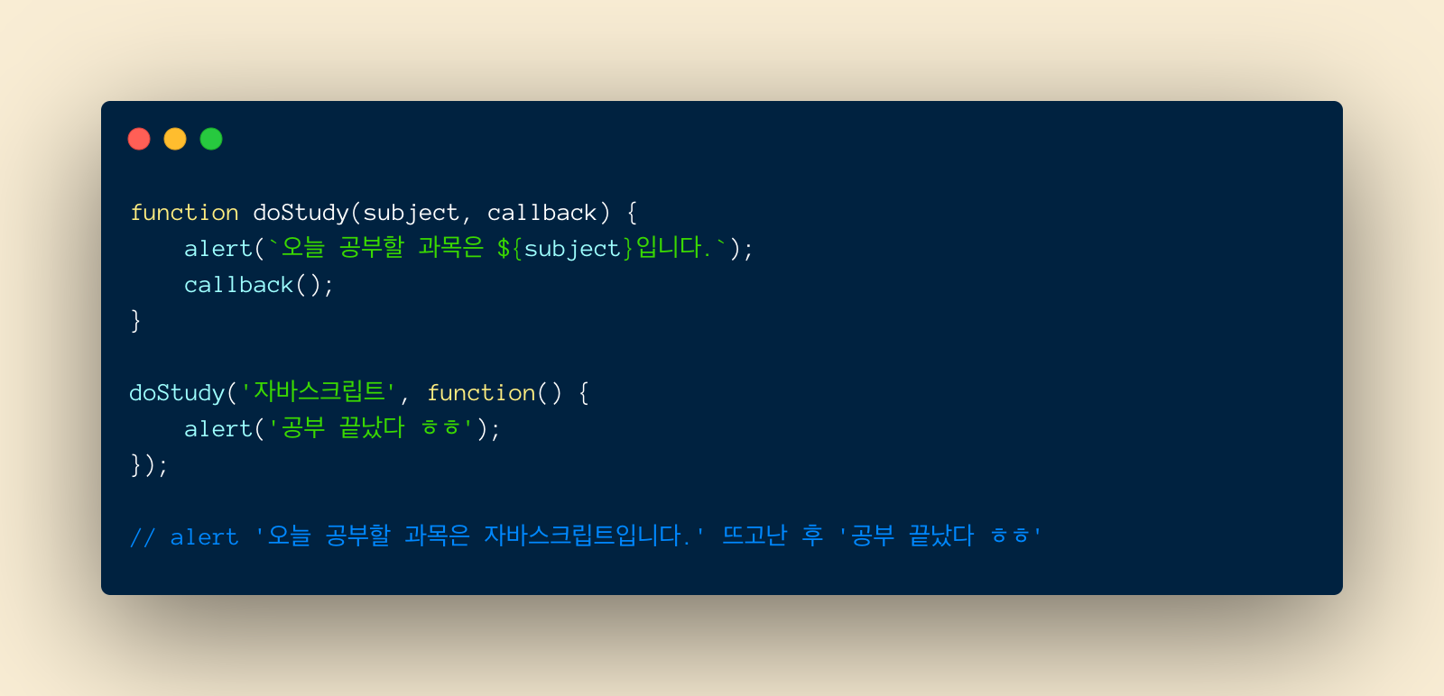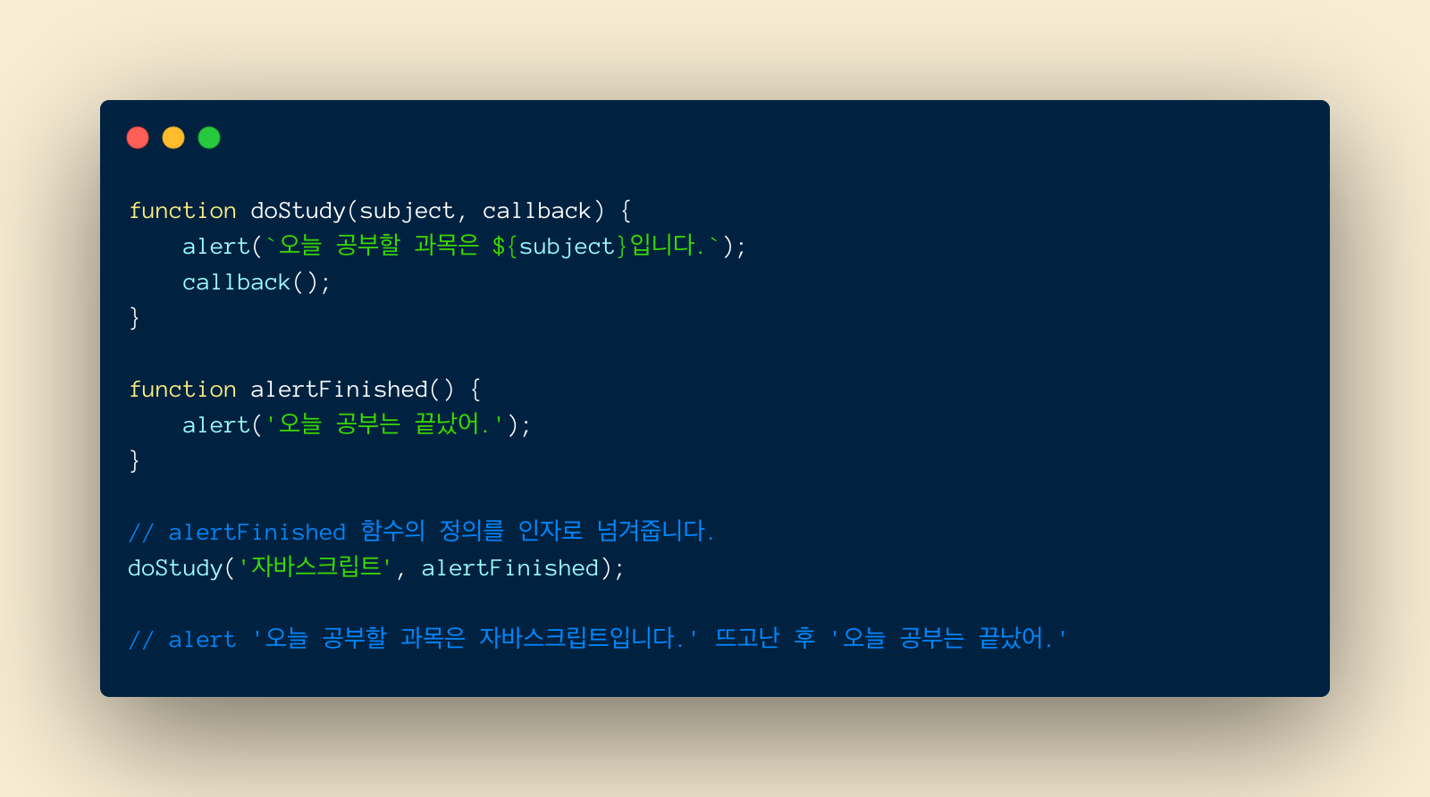 이제 doStudy()함수의 두 번째 인자로 callback을 넘겨줌으로써 콜백 함수를 추가합니다. doStudy() 함수를 호출할 때 두 번째 인자 자리에서 콜백 함수를 정의할 수 있습니다.