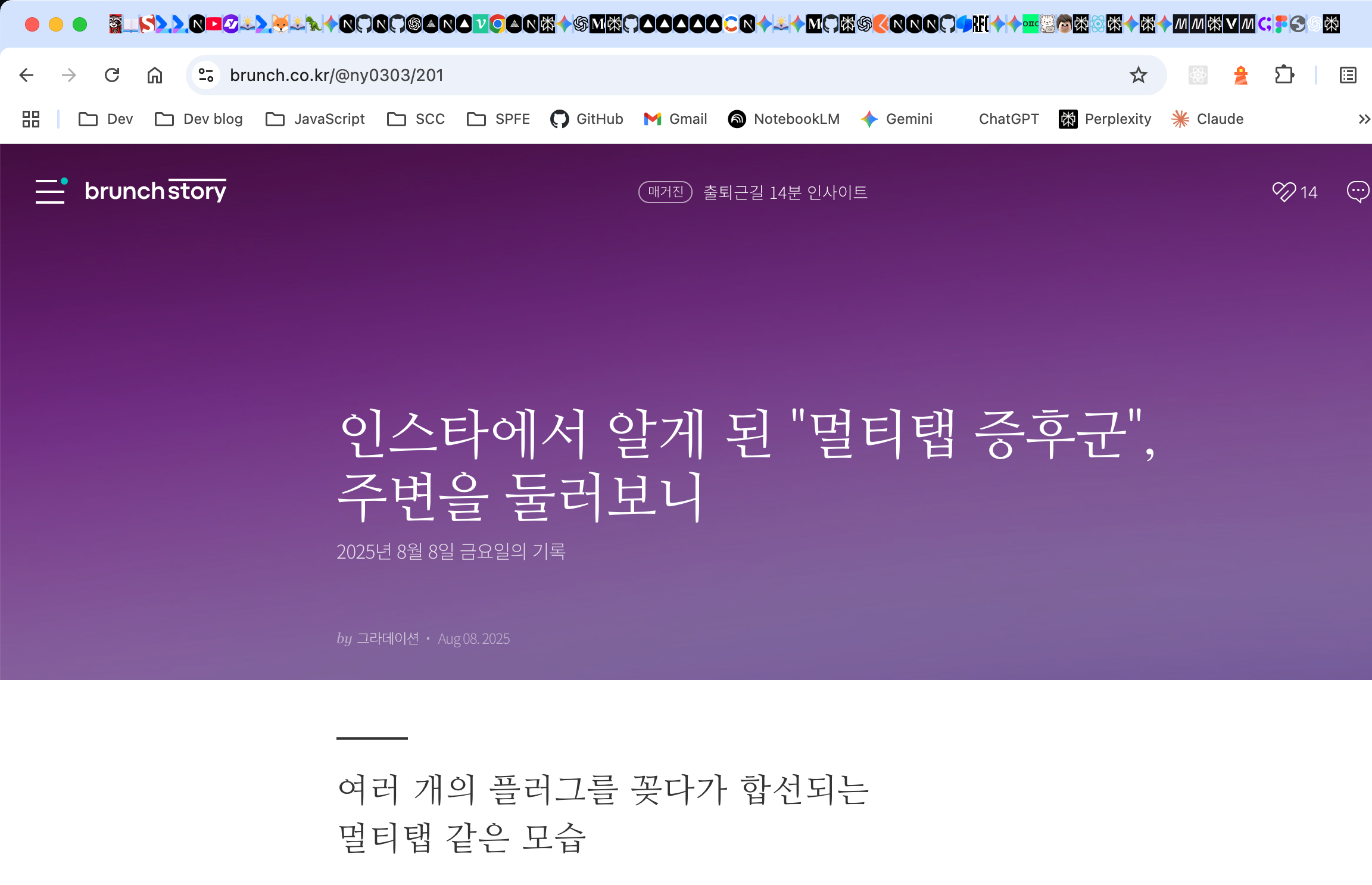 2025년 8월 8일 금요일의 기록 | 여러 개의 플러그를 꽂다가 합선되는 멀티탭 같은 모습 출근길 인스타에서 "멀티탭 증후군"이라는 단어를 처음 봤을 때 이게 뭘까 싶어서 찾아봤다. 여러 개의