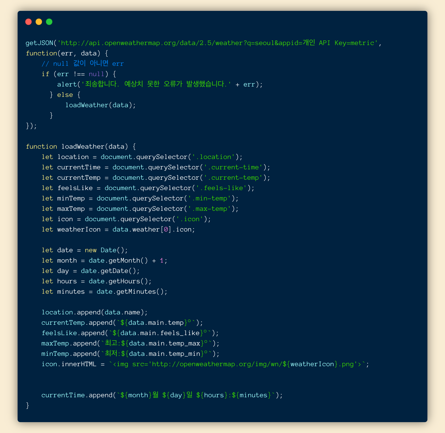 1편에 만들었던 코드를 토대로 alert가 아닌 loadWeather(data) 함수를 만들어 보겠습니다.