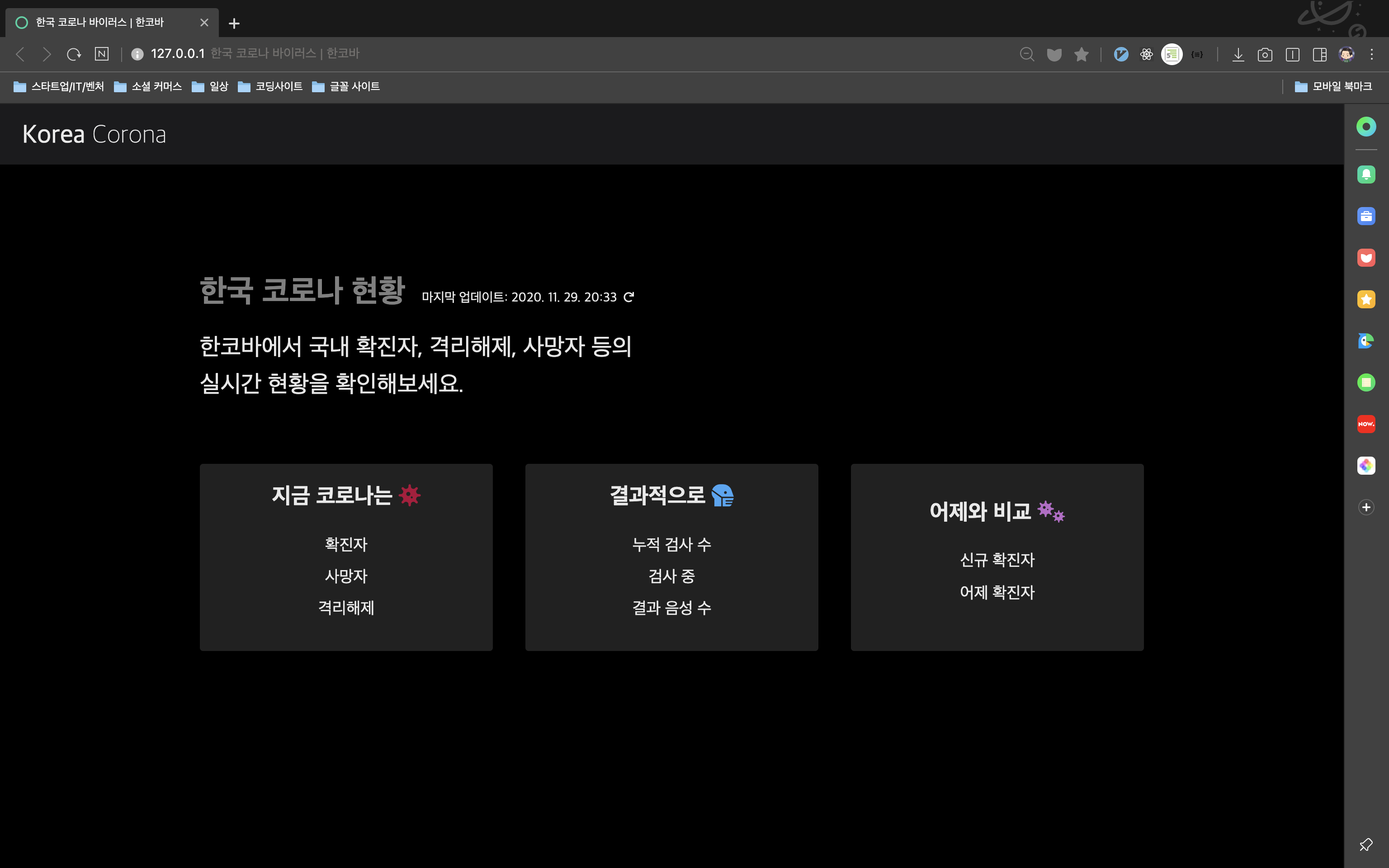 처음 시작은 무난했습니다. 첫 날은 프로젝트 자체에 고민을 굉장히 많이 했습니다. 일주일이란 시간 안에 완성해야하기 때문에 'Open API를 사용해서 어떻게 재밌고 심플한 웹 사이트를 만들 수 있을까'에 중점을 두고 고민을 했습니다. 그 와중에 국내에 다시 코로나 확진자 수가 급증했고(11월 27일 기준), 구상한 디자인과 퍼즐이 조금씩 맞춰지면서 국내 코로나 현황을 알려주는 '한국 코로나 바이러스 | 한코바'를 기획하게 됐습니다.