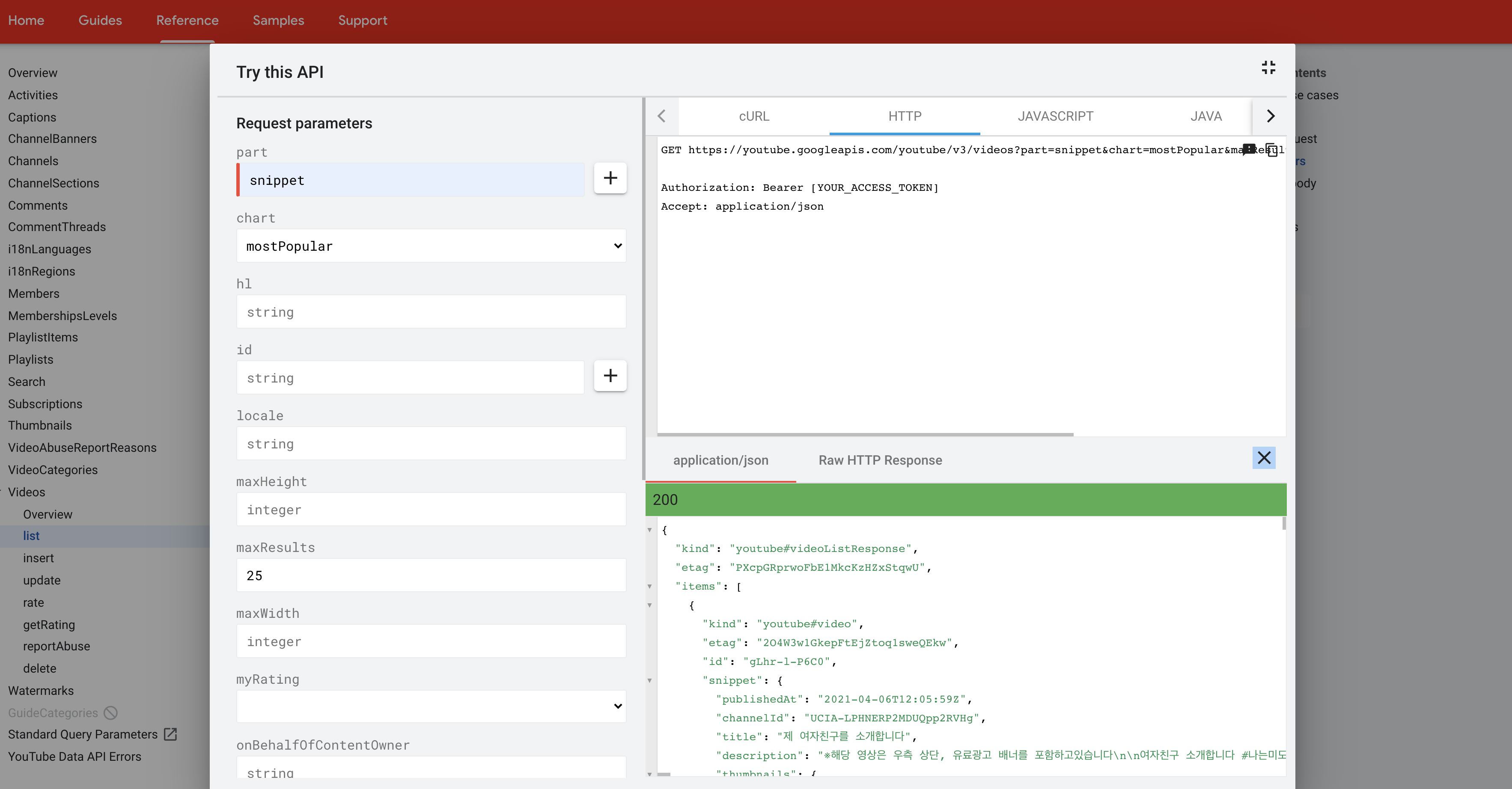 개인 키까지 발급을 받았다면 이제 사용을 해보자. 유튜브 API Reference -> Videos -> list로 들어가서 다양한 HTTP 요청을 해보자. 참고로 언어 설정을 한국어로 하면 테스트를 못한다. 영어로 바꿔서 Try This API를 클릭하자.(Google OAuth 2.0은 사용하지 않기 때문에 체크를 해제 했다.)