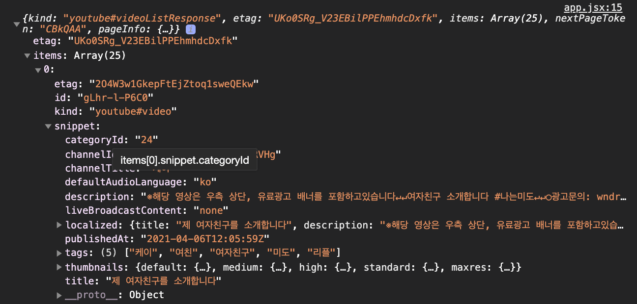 그럼 이제 화면이 렌더링 되면 비동기적으로 인기있는 동영상들을 받아와서 setVideos를 통해 관련 데이터를 업데이트 해줄 것이다.