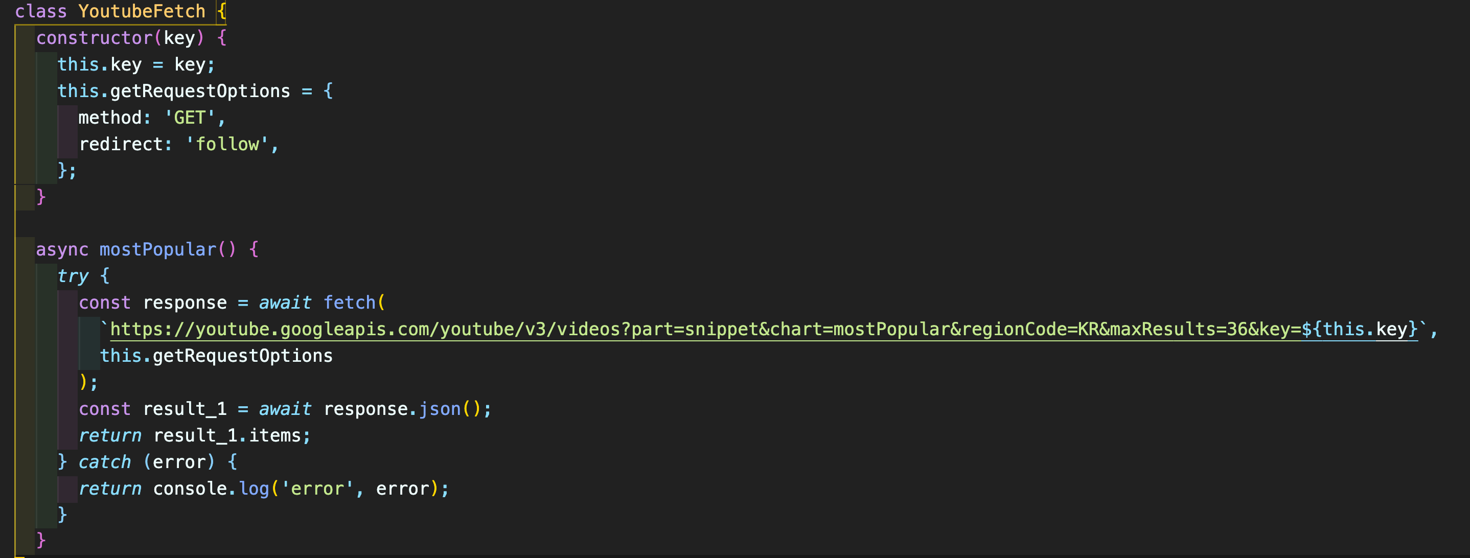 - 유튜브 API 중 channels API는 채널의 썸네일을 불러오기 위해 사용하였는데 불러오기 위해선 parameter로 videos API의 channelId를 입력했어야 했다. 다시 말해 videos API를 다 불러온 후 channelId를 가져와 channels API를 불러와야 했다. 또한 channels API를 전부 불러오기 전에 렌더링이 먼저 되어 이미지를 제대로 불러오지 못했다. 이에 대한 해결책이 `Promise.all` 메서드였다.