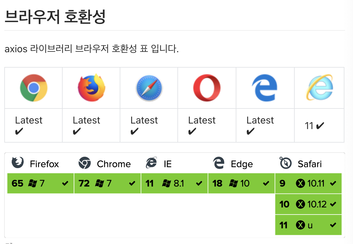 - 현재(21.4.30) axios 러닝 가이드와 axios 깃허브의 브라우저 호환성이 약간 차이가 있는듯 하다.