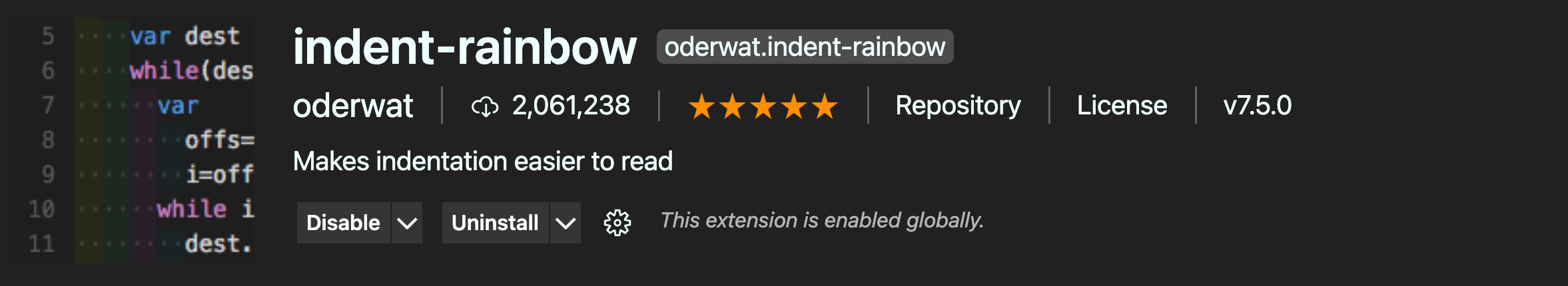 Extension 모음 1편에서 Bracket Pair Colorizer가 괄호에 색상을 입혀준다면 이 익스텐션은 위 사진과 같이 들여쓰기에 색상을 입혀준다. 이 익스텐션도 설치하면 코드 가독성이 더 좋아진다.