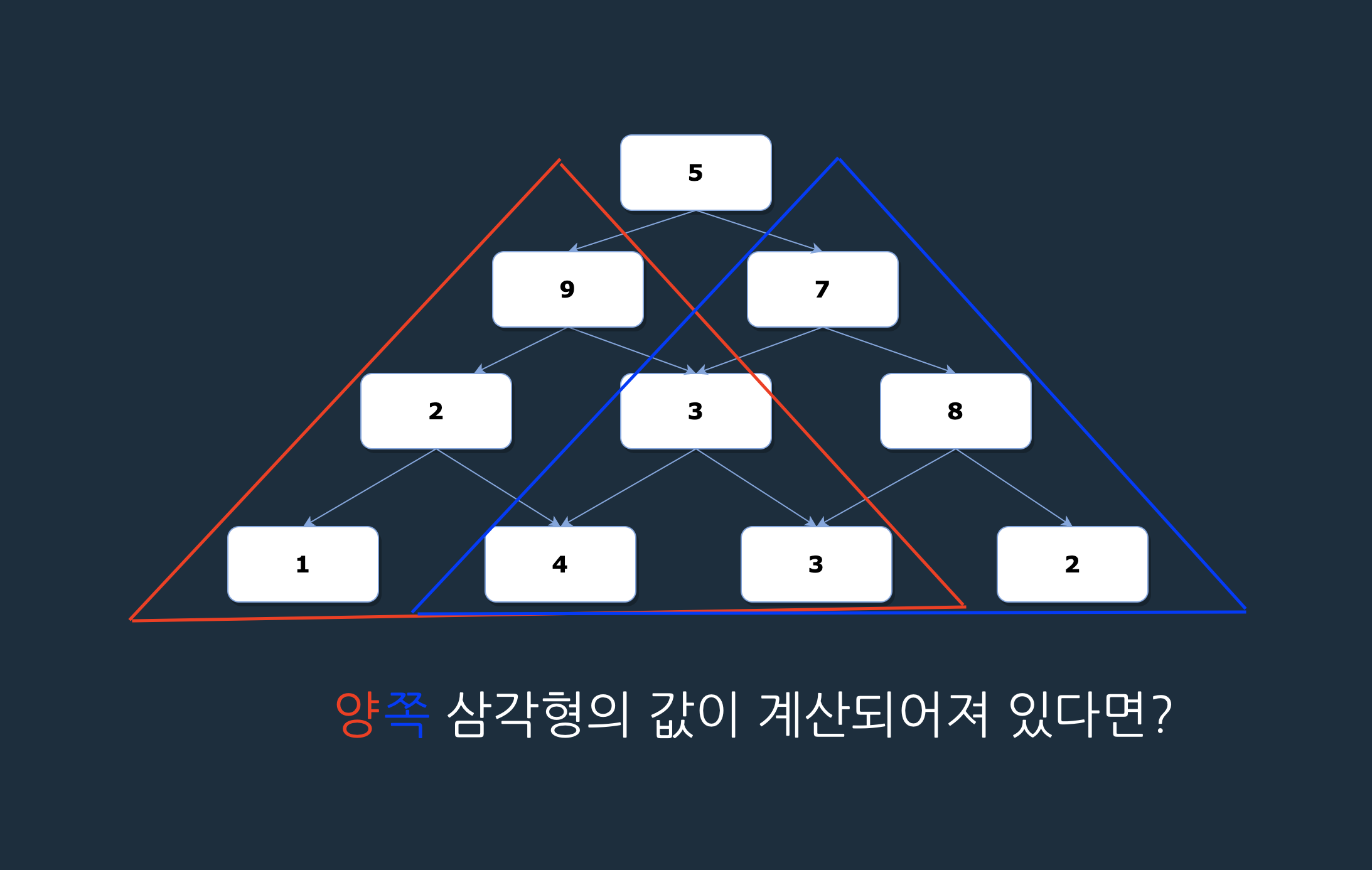 양쪽 삼각형의 값(작은 문제)이 계산되어져 있다고 생각을 하면 피라미드의 최댓값(큰 문제)은 다음과 같다.
