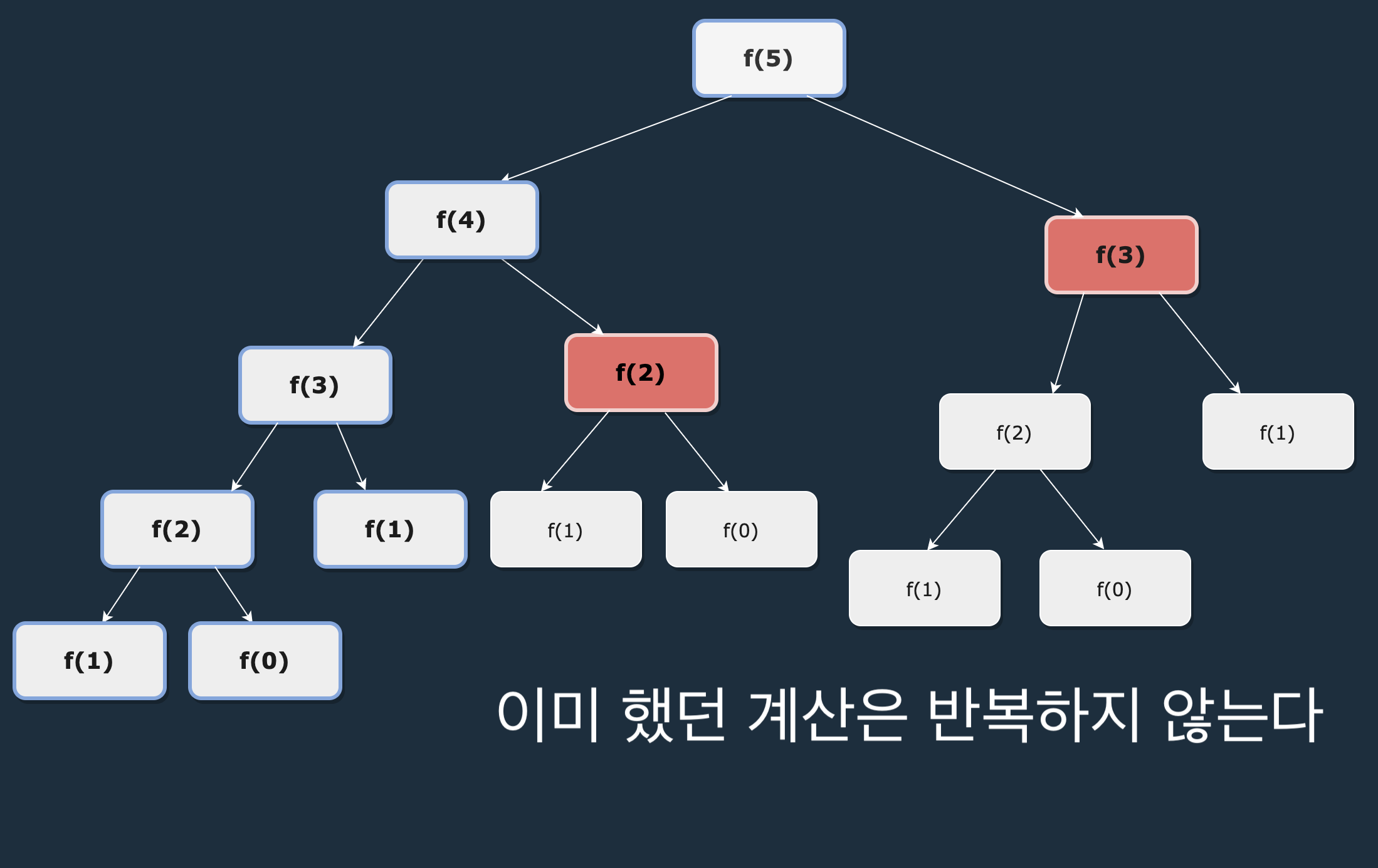 똑같은 코드를 수행했을 때 오른쪽의 f(4)의 계산을 보자. f(4)의 계산에서 이미 f(2)와 f(3)의 계산을 수행했기 때문에 저 값을 기억한 후 오른쪽의 f(2), f(3)을 계산할 필요 없이 기억한 값 그대로를 반환하면 밑의 불필요한 계산을 피할 수 있다.