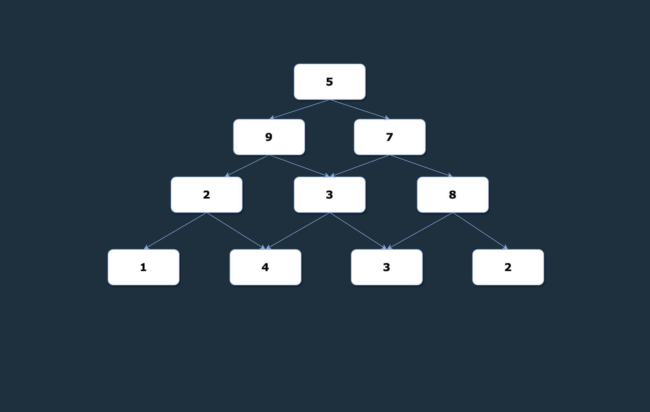 피라미드 형태로 수들이 주어질 때, 꼭대기에서 아래로 내려오면서 지나간 수들의 합의 최댓값은 무엇일까?(단, 내려올 때는 반드시 자신의 바로 아래 두 수 중 한 군데로 내려가야 한다.)
