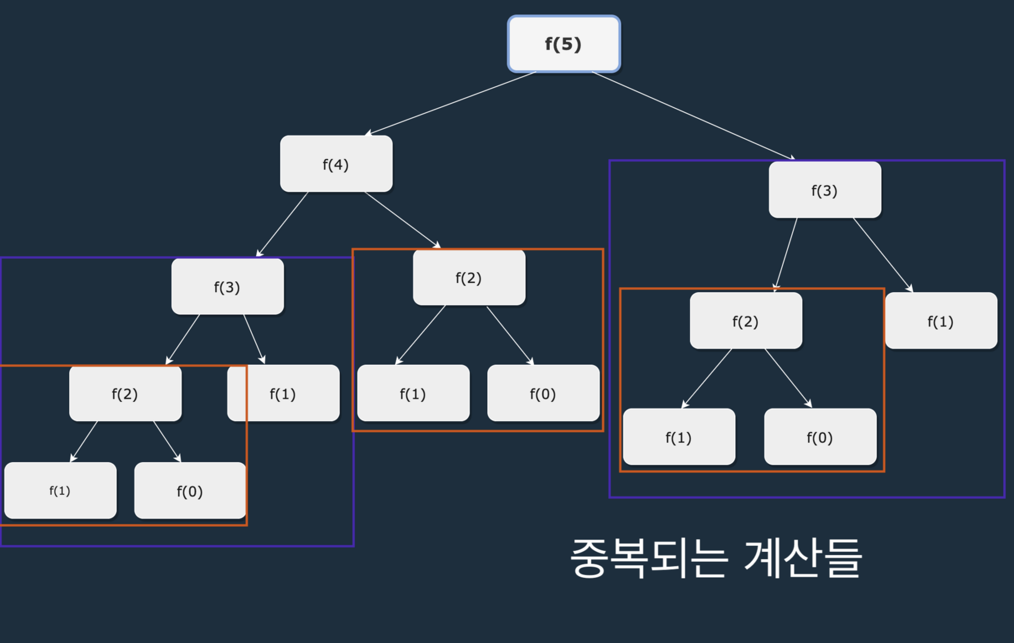 f(5)를 구하기 위해 f(4)와 f(3)을 호출, f(4)를 호출하기 위해 f(3), f(2)을 호출...이런 계산들이 수행이 되고 결국 중복되는 계산들로 인해 낭비가 발생하게 된다. 만약 그 수가 크다면 낭비는 더욱더 크다.
