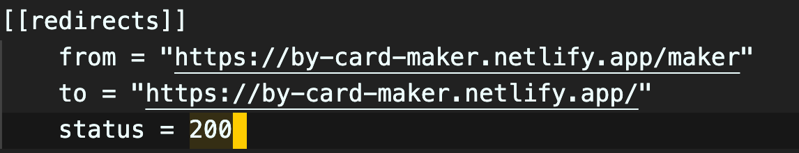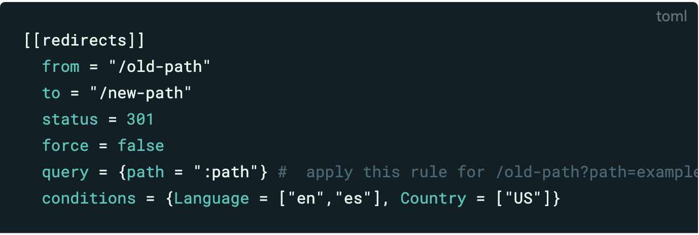 netlify.toml 파일에서 직접 리디렉션을 관리할 수 있습니다. 리디렉션을 선언하려면 [[redirects]] 머리글이 있는 항목을 사용하십시오. - Netlify Docs