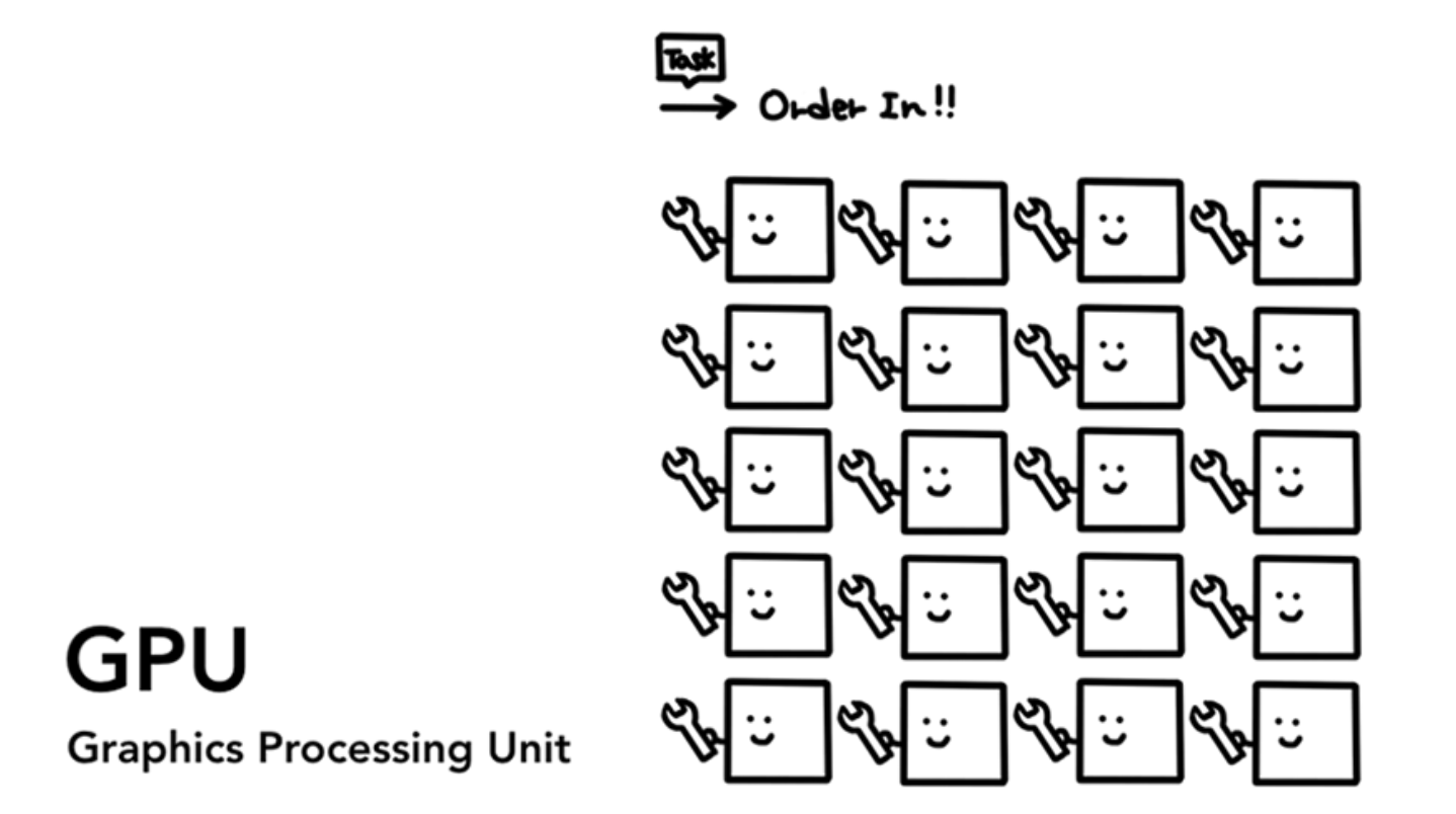 GPU는 간단한 작업들을 수많은 코어에서 동시에 처리하는 것에 특화되어 있다. 원래는 그래픽을 처리하기 위해 개발되었다. 최근에는 GPU 가속 연산 덕분에 GPU 혼자서 더 많은 종류의 연산을 처리 가능하도록 발전하고 있다.