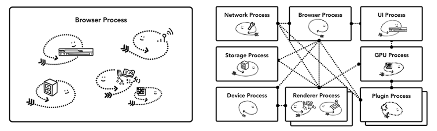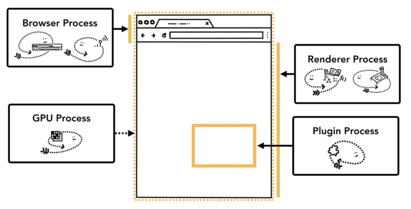 여기서 크롬 브라우저는 2번 멀티 프로세스 아키텍처로 동작을 한다. 멀티 프로세스 아키텍처의 장점을 알아보기 전에 각 프로세스가 어떤 일을 하는지 궁금하다.