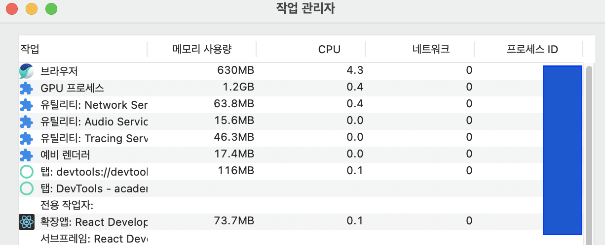 확장 프로세스나 유틸리티 프로세스 등 몇몇 프로세스들이 더 존재한다. 실행 중인 프로세스를 더 보고 싶다면 ⋮를 클릭 -> 도구 더보기 -> 작업 관리자를 통해 실행 중인 프로세스 목록과 CPU/Memory를 얼마나 사용하고 있는지 보여준다.
