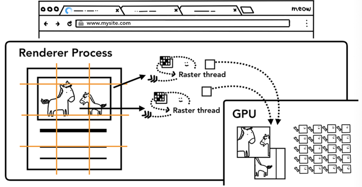 - 래스터 스레드들은 각 타일을 래스터화하고 GPU 메모리에 저장한다.
