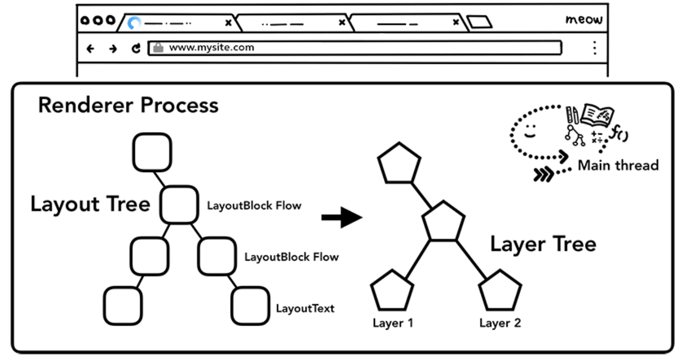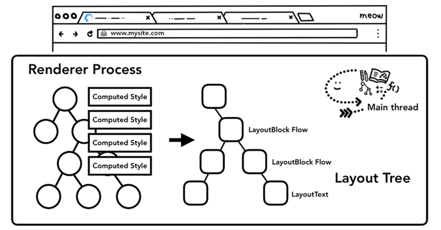 이제 렌더러 프로세스는 문서의 구조(DOM)와 각 노드에 대한 스타일(CSSOM)을 알게 되었다. 하지만 아직은 페이지를 렌더하기에 충분하지 않다. 어떤 그림을 친구에게 전화로 설명한다고 상상해보자. "큰 빨간 원 하나와 작은 파란 사각형 하나가 있어"의 설명으로는 친구가 정확히 그림이 어떻게 생겼는지 알기 쉽지 않다.