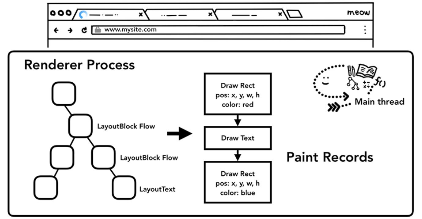 페인트 단계에서 메인 스레드는 레이아웃 트리를 따라가 페인트 기록을 생성한다. 페인트 기록은 "먼저 배경, 그리고 텍스트, 그리고 사각형!"과 같은 페인팅 과정의 내용이다.