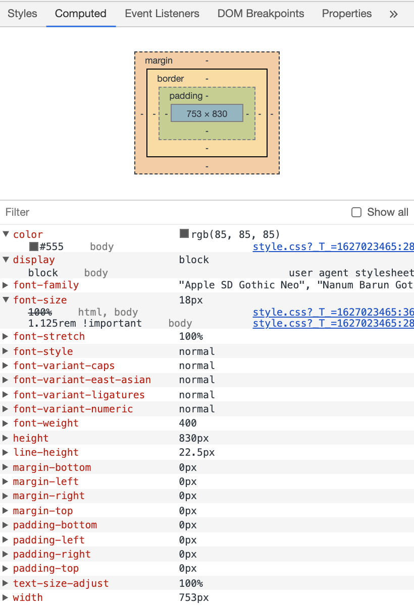 우리가 CSS를 전혀 사용하지 않더라도, 브라우저는 기본 스타일 시트를 가지기 때문에 각 DOM 노드는 계산된(computed) 스타일을 갖고 있다. 예를 들어 <h1> 태그는 <h2> 태그보다 더 크게 보여지며 margins는 각 요소마다 정의된다.