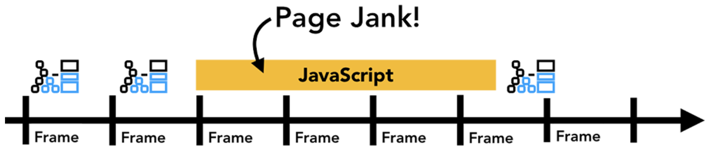 렌더링 동작이 스크린의 새로 고침에 뒤쳐지지 않는다고 하더라도 이러한 연산은 메인 스레드에서 실행된다. 이는 자바스크립트가 앱이 실행 중일 때 방해(blocked) 할 수 있다는 뜻이다.