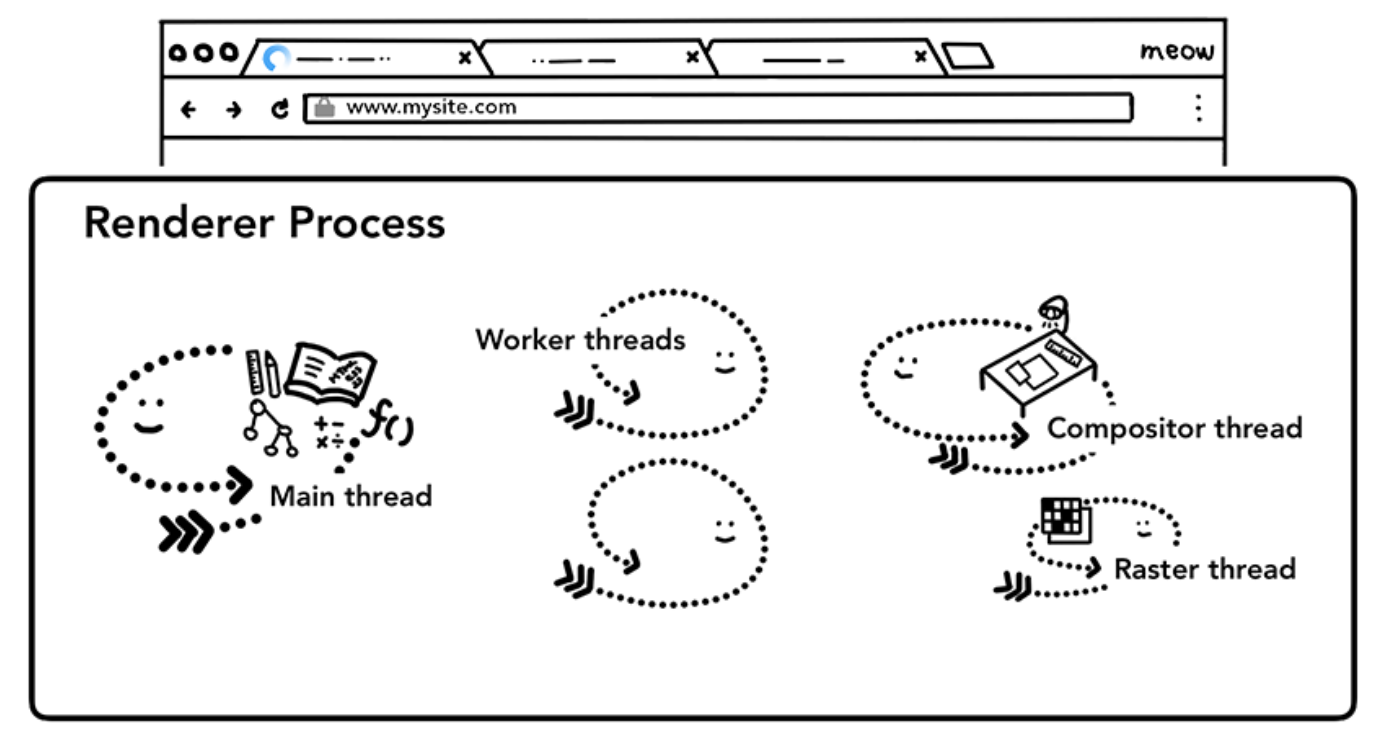 렌더러 프로세스는 브라우저 탭 안에서 일어나는 모든 일들을 담당한다. 여기서 메인 스레드가 우리가 구현한 대부분의 코드를 처리한다. 웹 워커 또는 서비스 워커를 사용할 경우엔 워커 스레드가 자바스크립트 코드 일부분을 처리하게 된다. 컴포지터와 래스터 스레드는 렌더러 프로세스 내부에서 페이지를 효율적이고 매끄럽게 렌더하기 위해 실행된다.