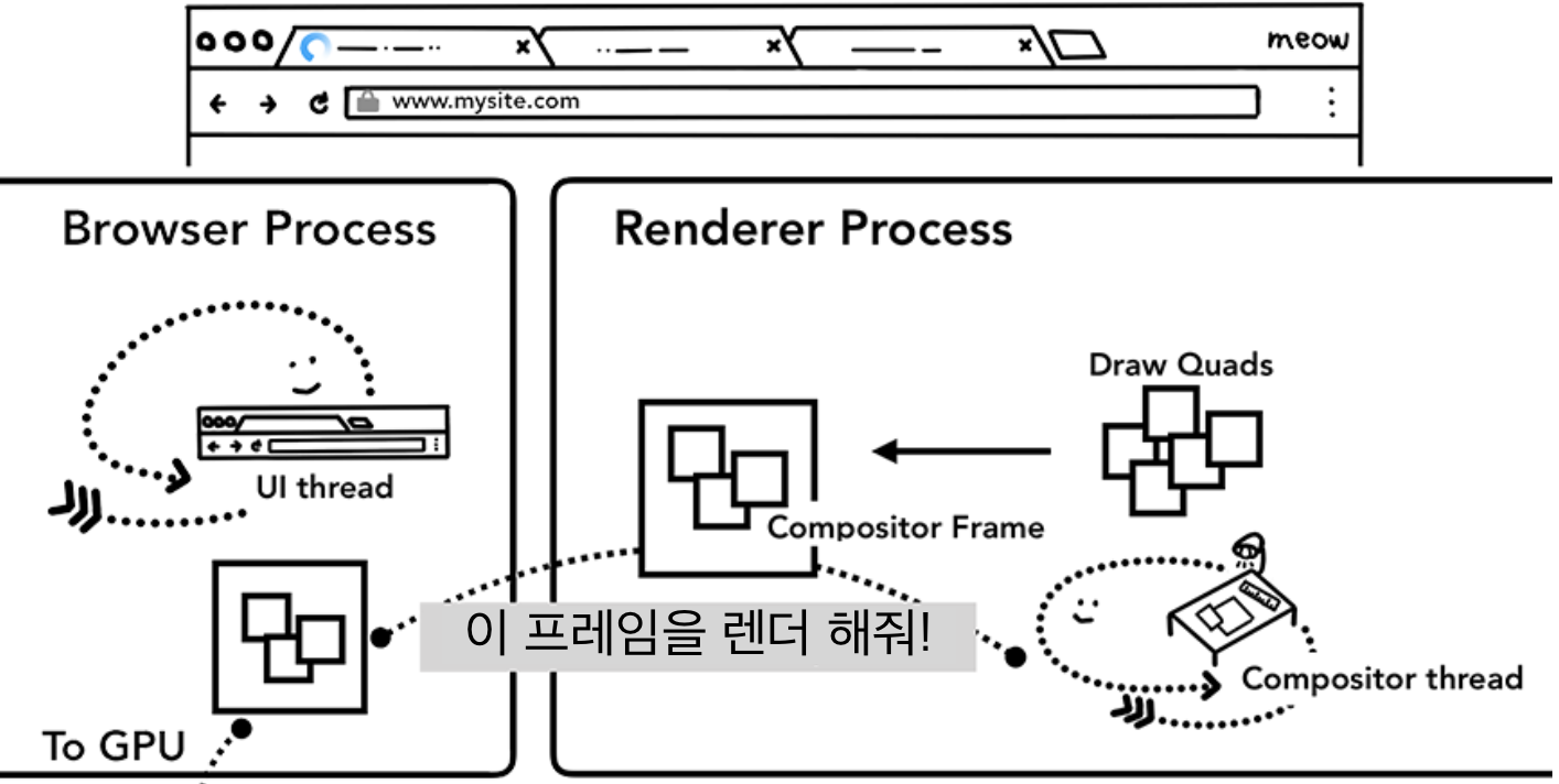 - 컴포지터 프레임은 IPC를 통해 브라우저 프로세스에게 넘어간다.(이 때, 다른 컴포지터 프레임이 브라우저 UI 변화에 따라 UI 스레드에 의해 또는 확장 기능에 대한 다른 렌더러 프로세스들에 의해 추가 될 수 있다)