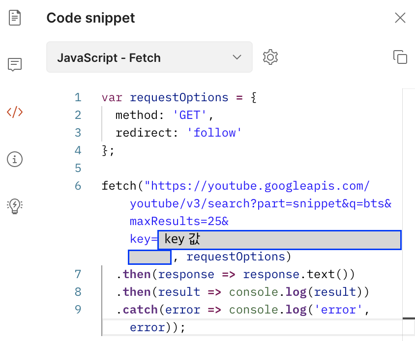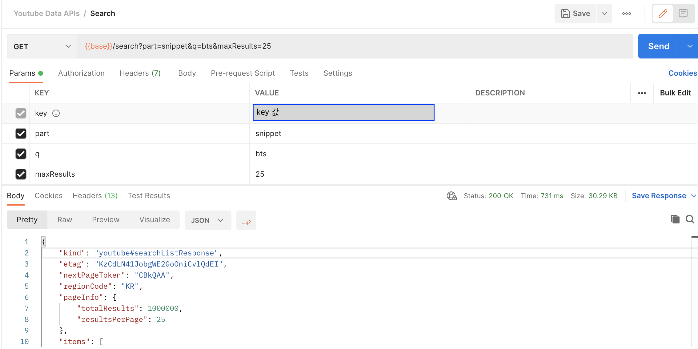 https://youtube.googleapis.com/youtube/v3/search?part=snippet&q=bts&maxResults=25&key=발급한 키 값