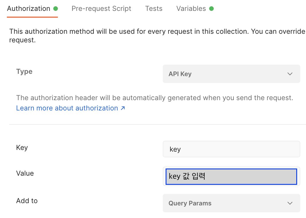 컬렉션을 생성 하고나서 Authorization 탭을 보면 API Key와 같은 권한 부여 관련 값을 추가 할 수 있다. Type을 API Key로 하고 Key에 key 이름을, Value에 key 값을 입력 해준다.(띄어쓰기 및 대소문자 주의!)
