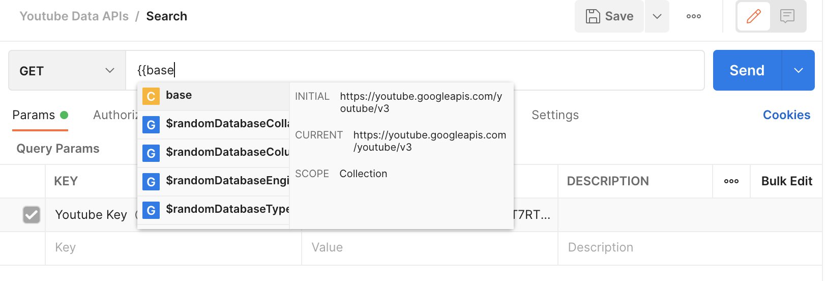 변수 사용은 중괄호({}) 두개로 감싸 사용할 수 있고 위 사진과 같이 자동완성 기능을 제공한다. 그 후 API 요청 사용법대로 내용들을 채워 나가는데 내가 원하는 데이터의 유튜브 API 검색 요청은 다음과 같다.