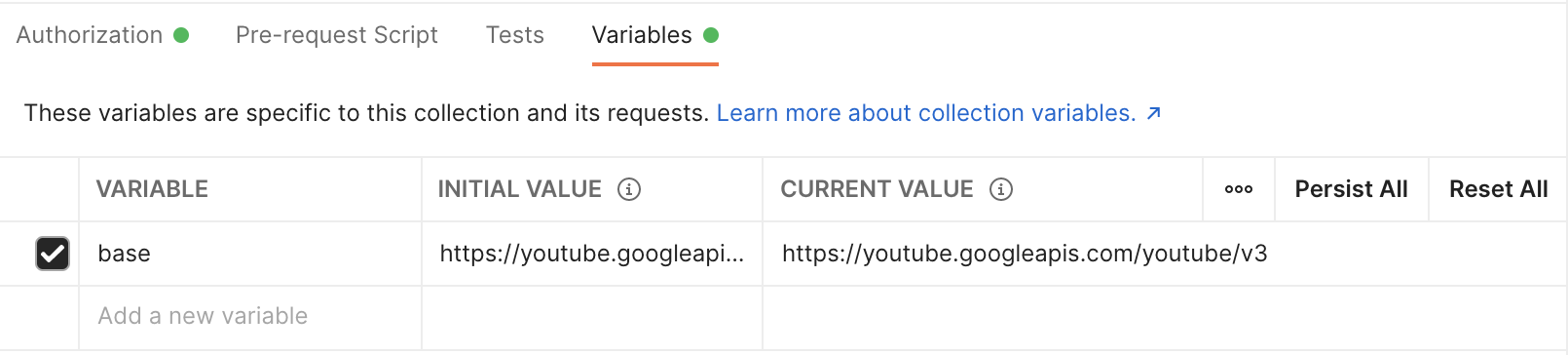 해당 컬렉션에서 반복적으로 사용되어지는 값이 있다면 variables 탭에서 설정할 수가 있다. 나는 공통적으로 쓰는 Base url을 설정해주었다.